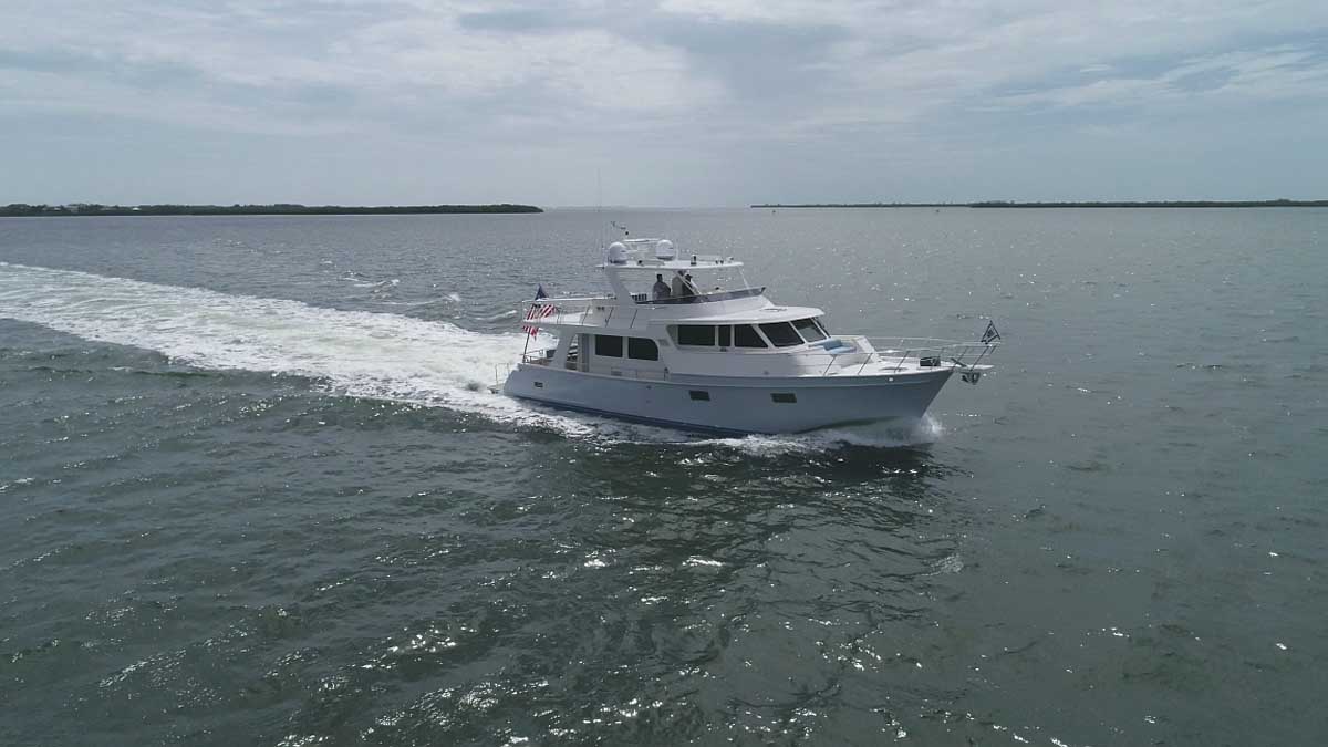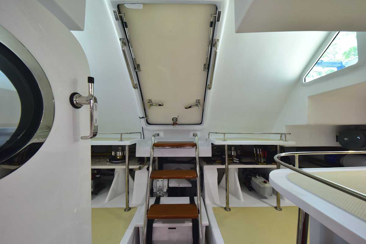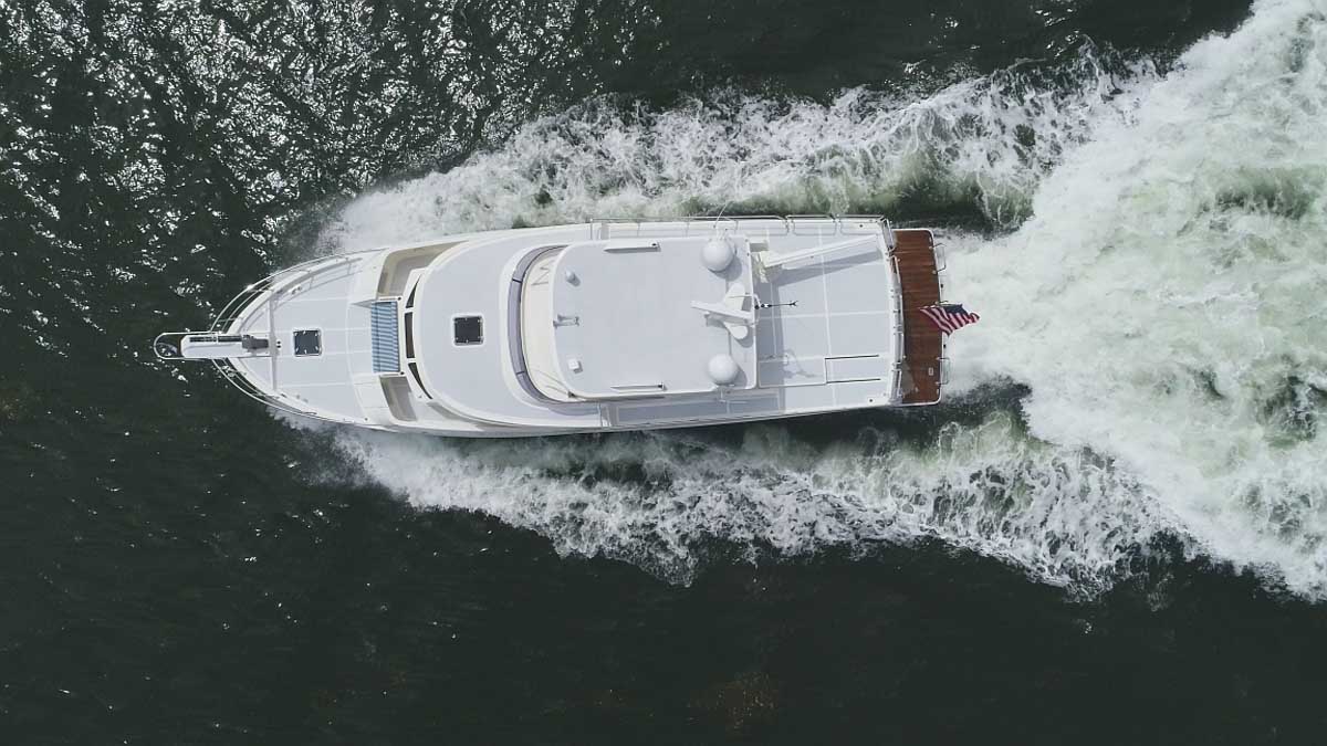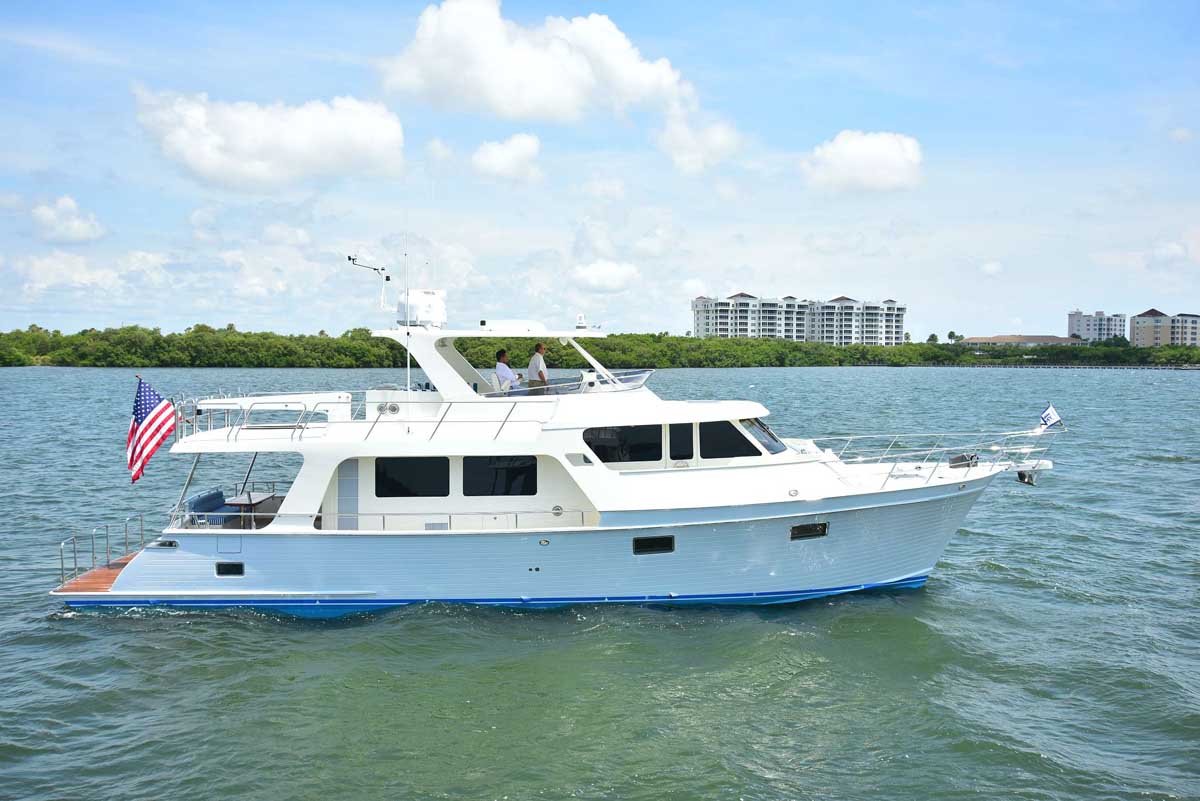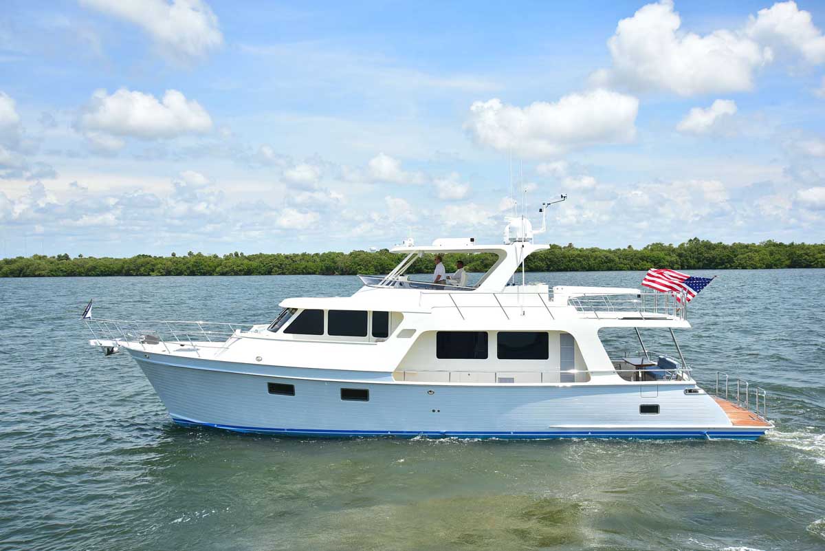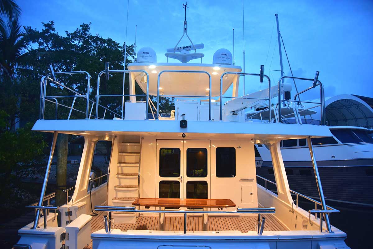 The introduction of the Marlow Explorer 53E in 2016 has brought a more fuel-efficient vessel due to the enhanced beam-to-length ratio and underwater design features significantly reducing parasitic drag. At the same time, interior and on-deck accommodation spaces are enhanced due to advances in composite and propulsion technology. Due to Marlow Yachts’ much acclaimed and awarded proprietary construction materials and techniques, the 53E boasts mechanical spaces equal to or larger than vessels ten feet longer. The effort of the Marlow engineers and designers makes it possible, in some layouts, to see the forward VIP while seated in the enclosed rudder room fully aft. This utterly unique flow-through traffic pattern is made possible by space-age engineering that eclipses all other products of similar dimensions.