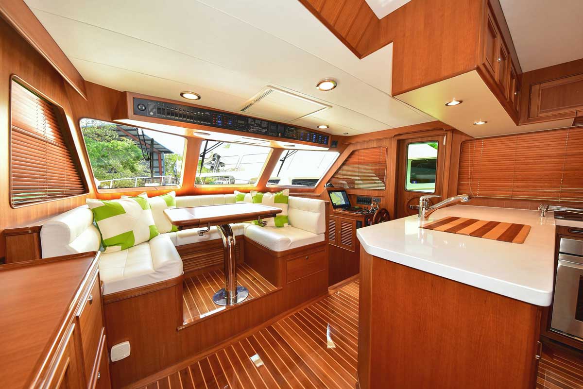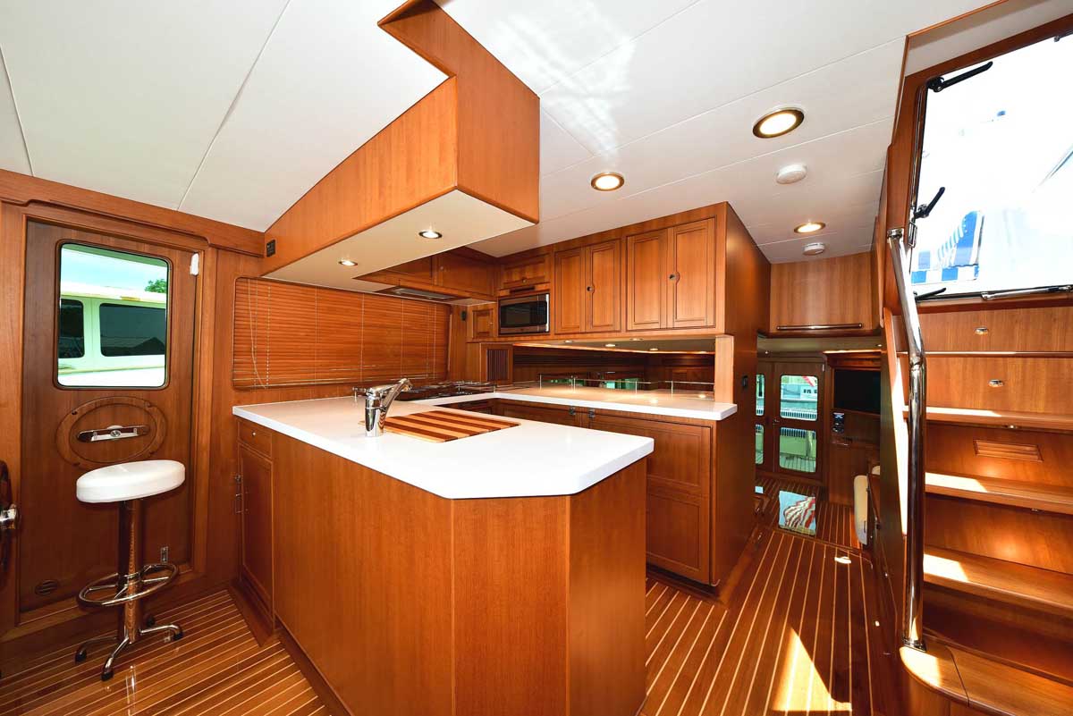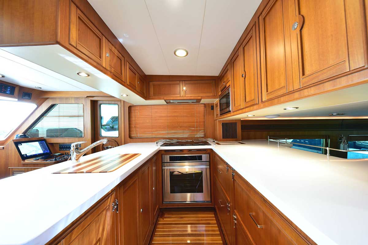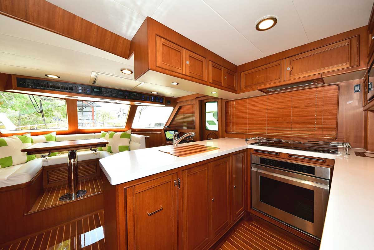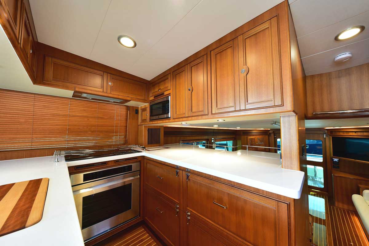The galley and dinette area in the pilothouse feature all the amenities needed for your gourmet pleasure. Two under-counter drawer refrigeration units, a Miele Speed oven with microwave function among the many cooking options, a Miele cooktop, and lots of overhead storage cabinetry. The dinette is horseshoe-shaped with a dropleaf table, allowing comfortable seating for conversation or dining. A teak cabinet unit on the port side has a wine cooler and a beverage refrigerator. On the starboard side is a compact yet fully capable helm.