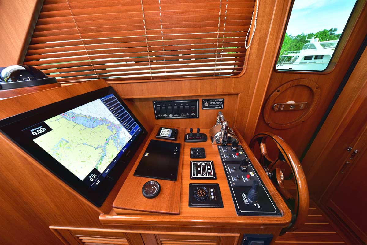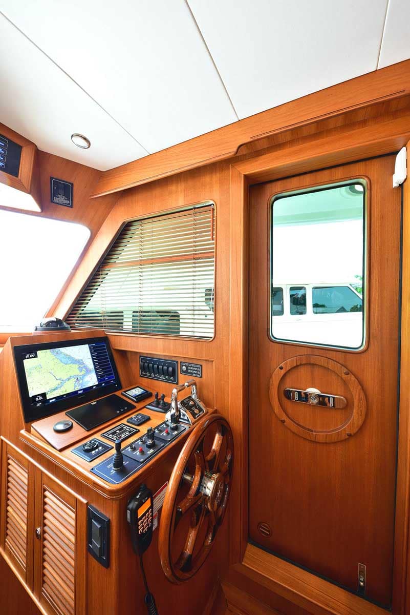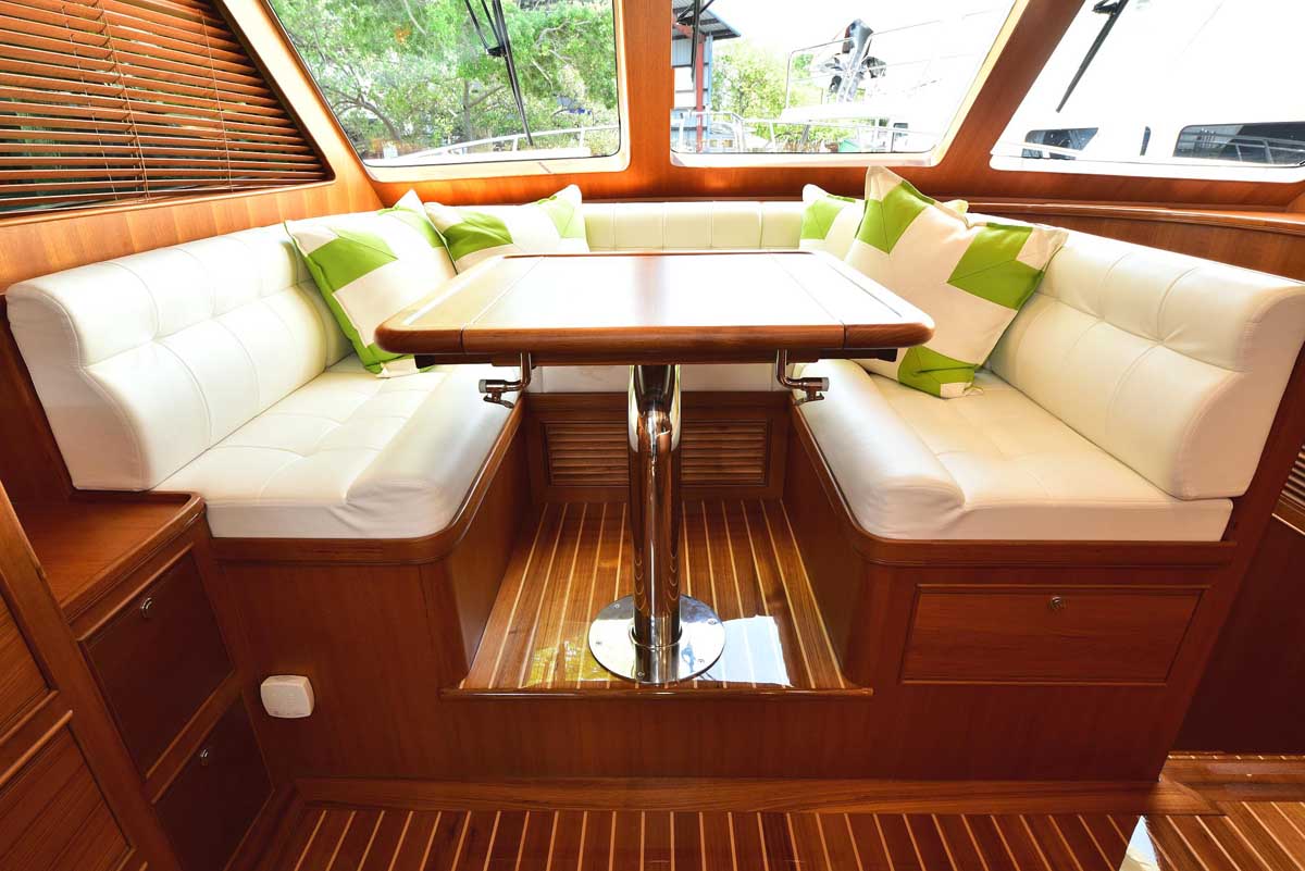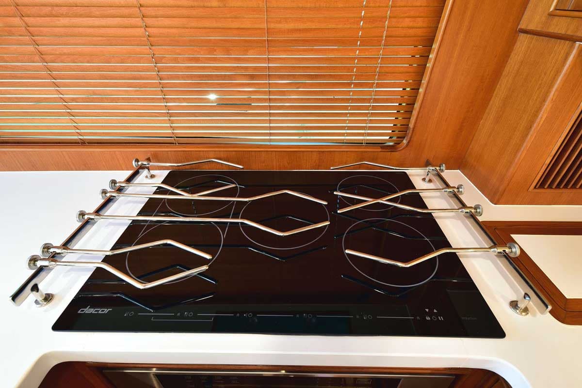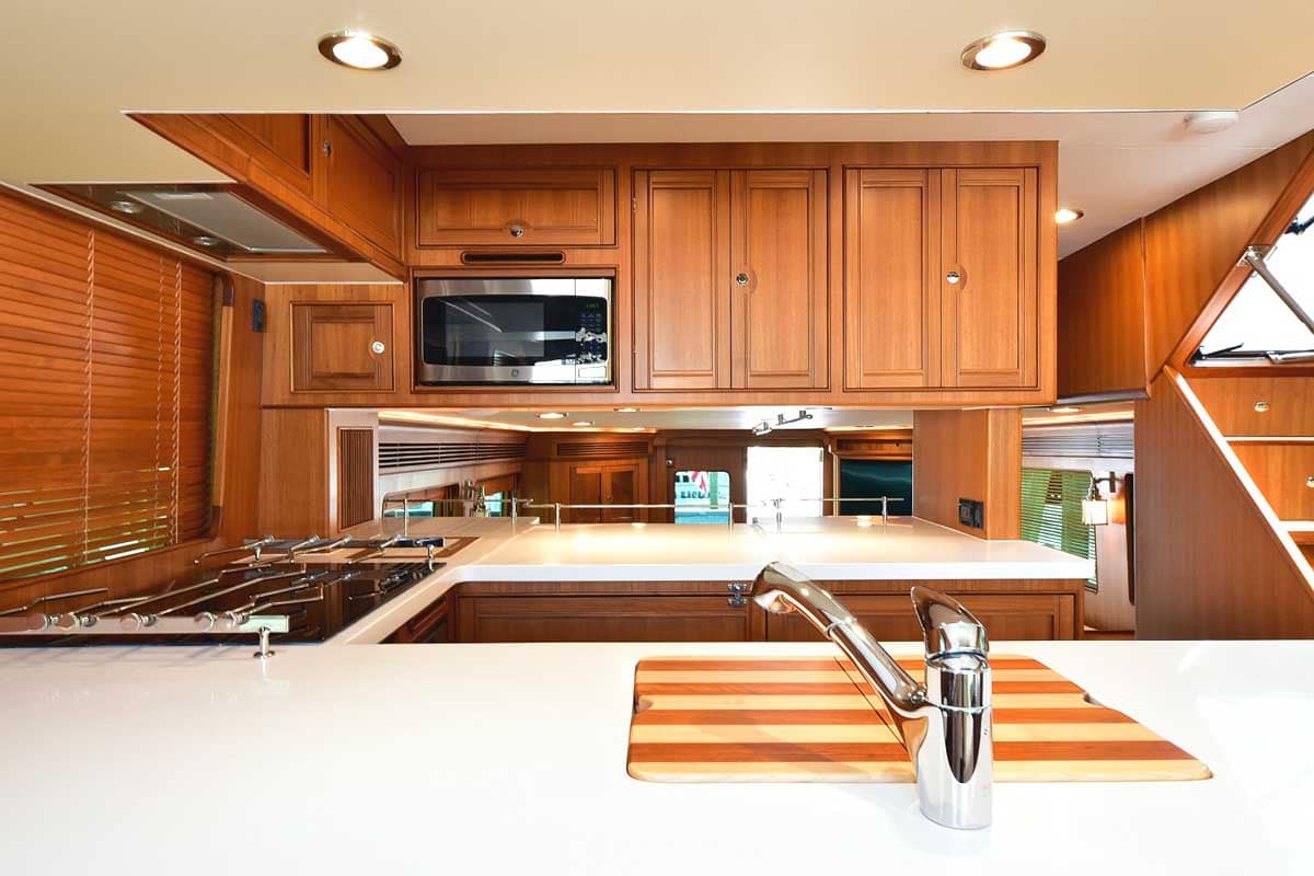 The galley and dinette area in the pilothouse feature all the amenities needed for your gourmet pleasure. Two under-counter drawer refrigeration units, a Miele Speed oven with microwave function among the many cooking options, a Miele cooktop, and lots of overhead storage cabinetry. The dinette is horseshoe-shaped with a dropleaf table, allowing comfortable seating for conversation or dining. A teak cabinet unit on the port side has a wine cooler and a beverage refrigerator. On the starboard side is a compact yet fully capable helm.