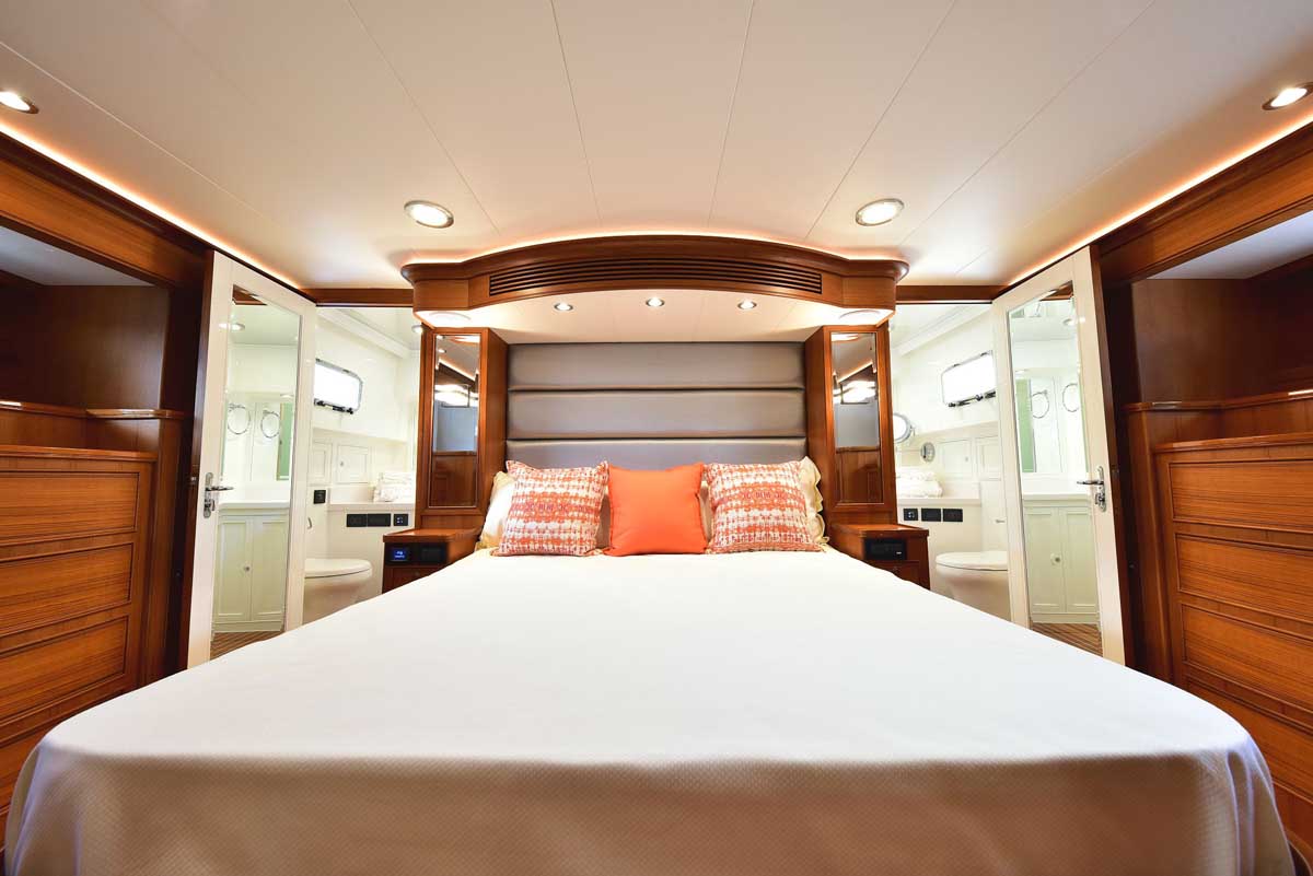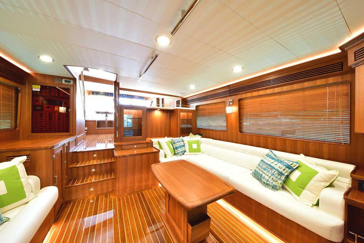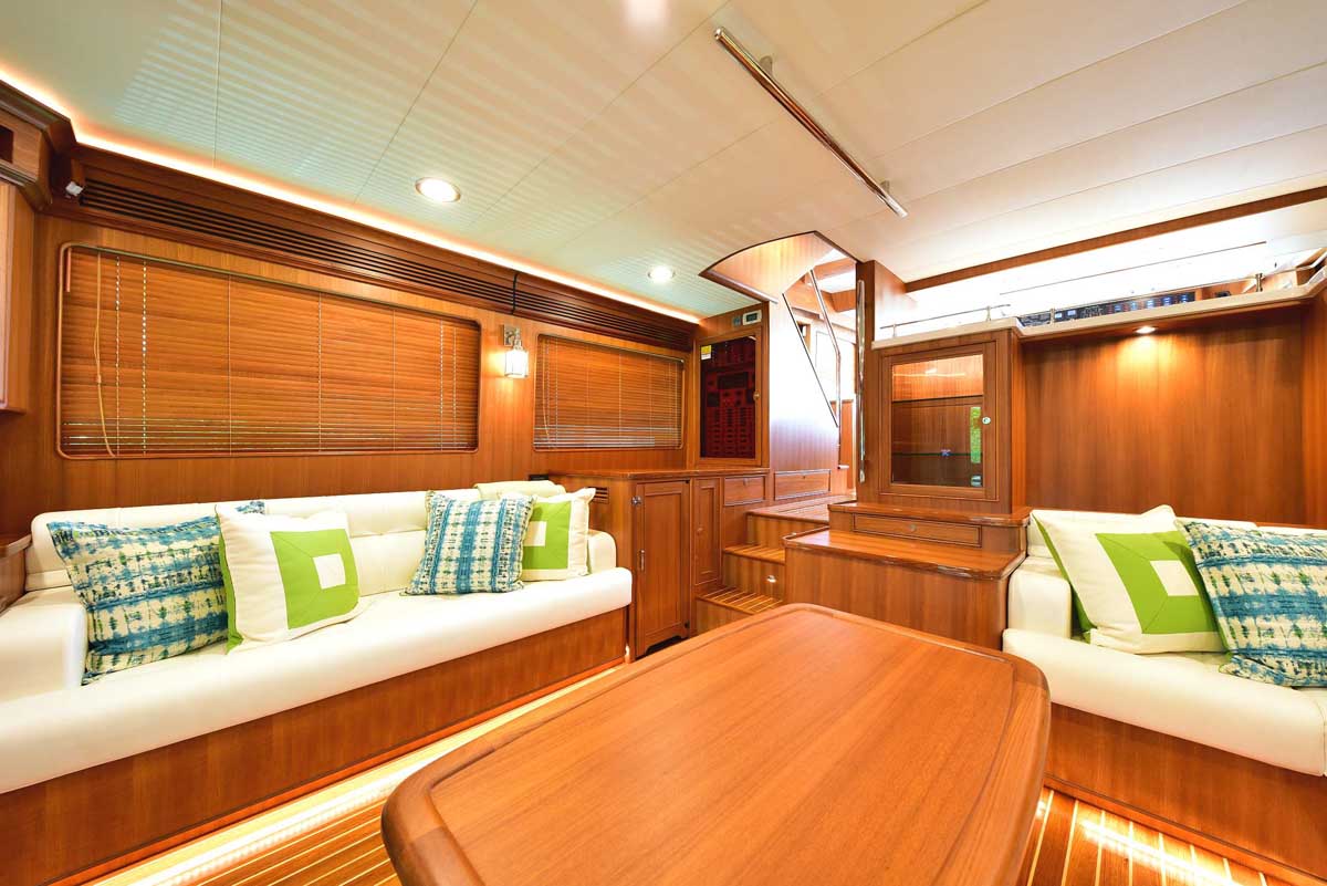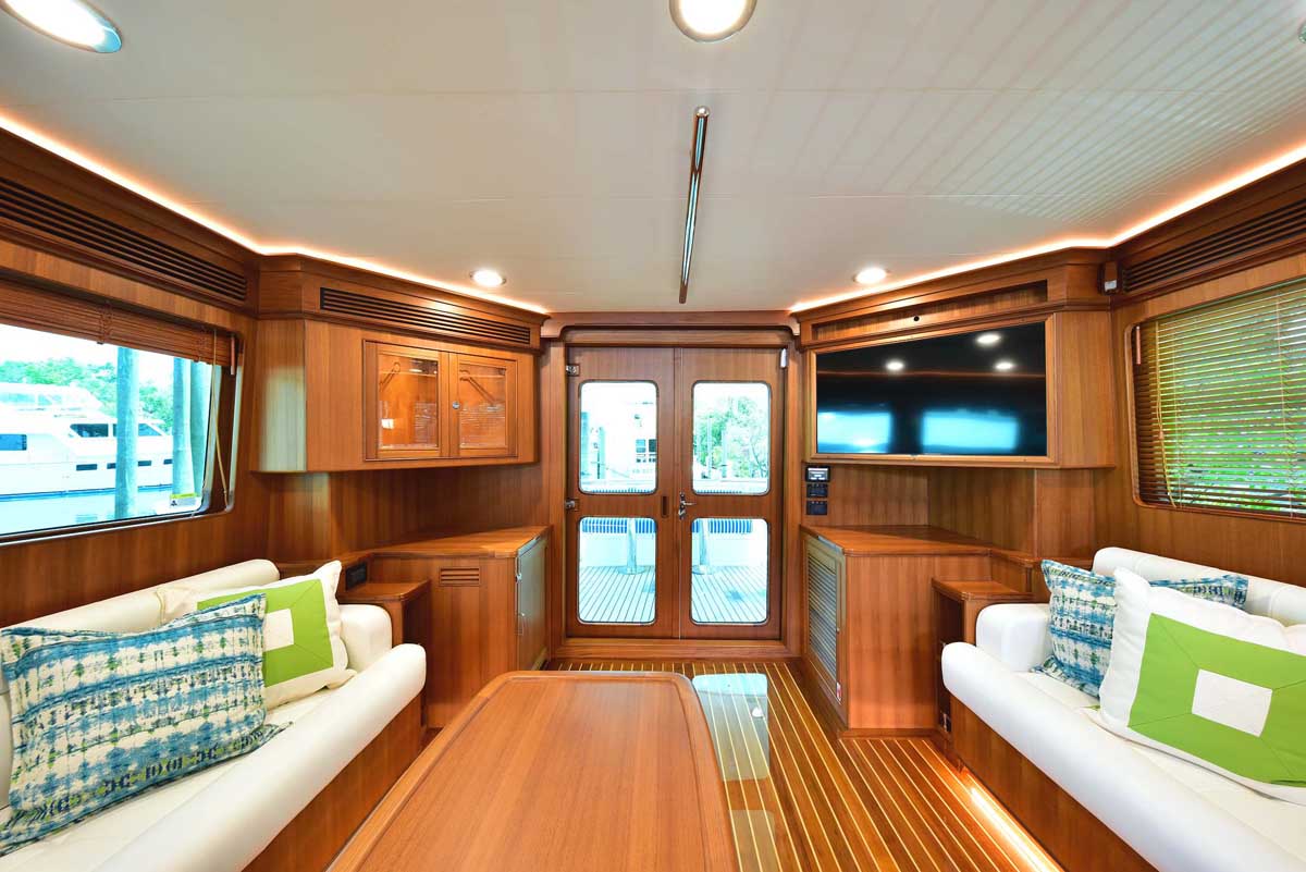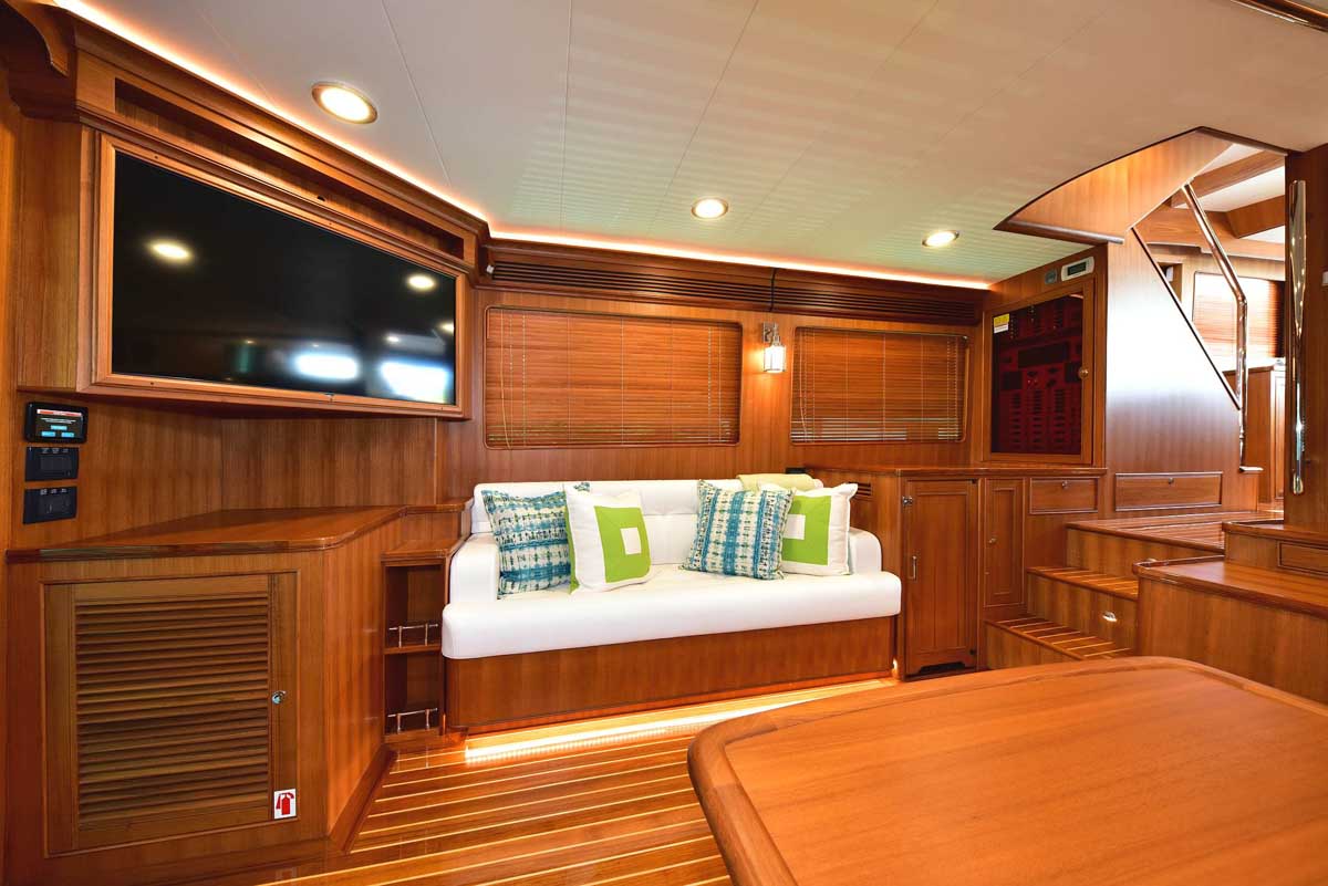 Hull number one was everything Marlow Yachts promised and more. The proportions on the interior layout are perfect. The spaciousness in every area makes one question: how is it possible in a yacht this size? Stepping into the cockpit, there is a bench seat across the transom with a lovely teak grate seat and table. Neither is attached to the cockpit sole, providing the additional visual effect of a larger cockpit area in one that is already very large. The bench is supported by the transom, and the curved table leg attaches under the bench. A storage cabinet and auxiliary helm are on the bulkhead wall. Stepping into the salon, you find the signature Marlow Yachts touch on all surfaces. On the starboard side, there is a work desk with the TV innocuously placed over it diagonally across the corner, allowing viewing from all seating areas. There is a long L-shaped settee on the starboard side, a large settee between the bar in the port aft corner, and a granite-topped cabinet forward.