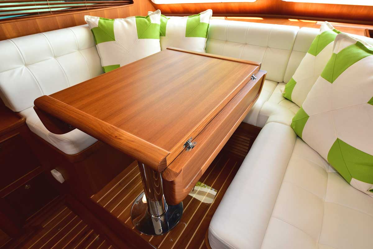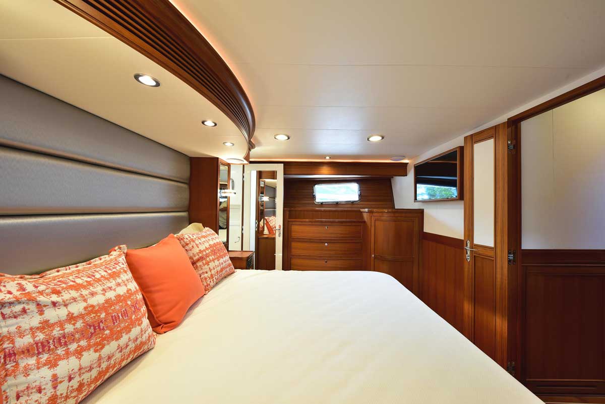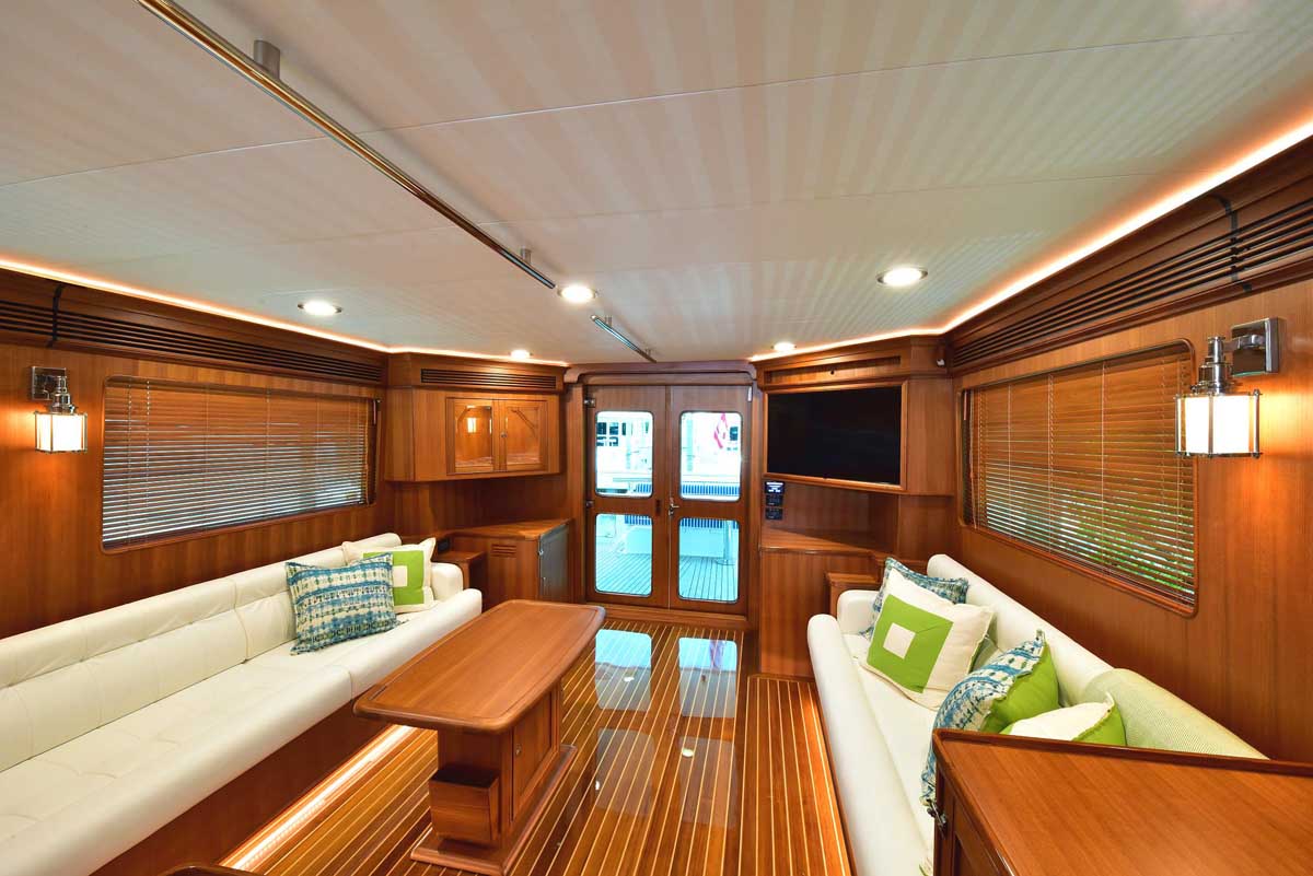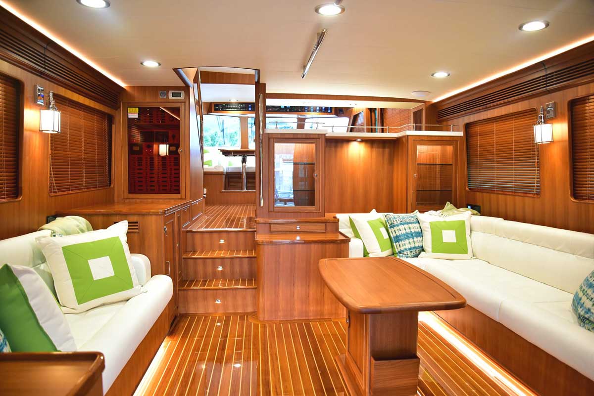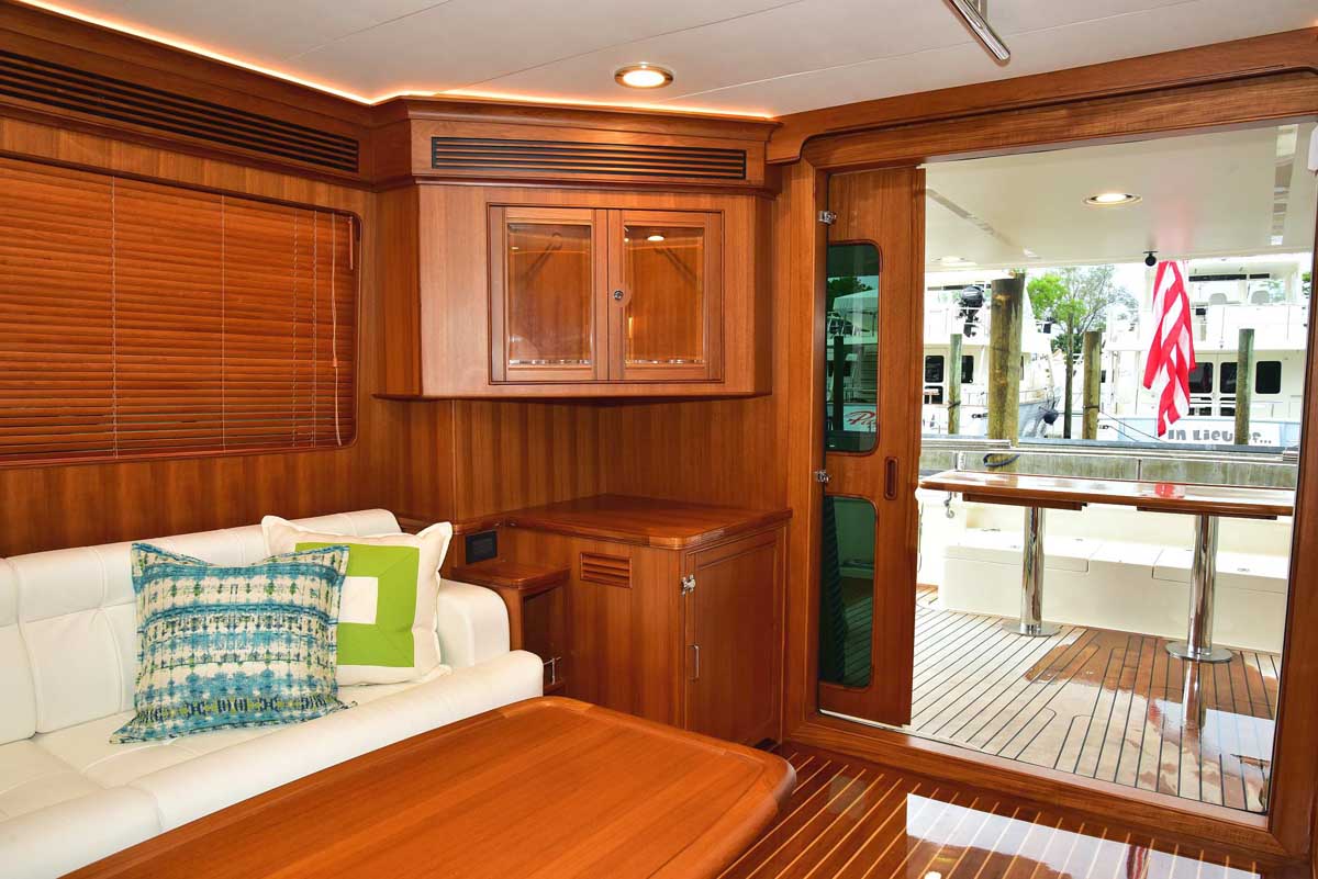 Hull number one was everything Marlow Yachts promised and more. The proportions on the interior layout are perfect. The spaciousness in every area makes one question: how is it possible in a yacht this size? Stepping into the cockpit, there is a bench seat across the transom with a lovely teak grate seat and table. Neither is attached to the cockpit sole, providing the additional visual effect of a larger cockpit area in one that is already very large. The bench is supported by the transom, and the curved table leg attaches under the bench. A storage cabinet and auxiliary helm are on the bulkhead wall. Stepping into the salon, you find the signature Marlow Yachts touch on all surfaces. On the starboard side, there is a work desk with the TV innocuously placed over it diagonally across the corner, allowing viewing from all seating areas. There is a long L-shaped settee on the starboard side, a large settee between the bar in the port aft corner, and a granite-topped cabinet forward.