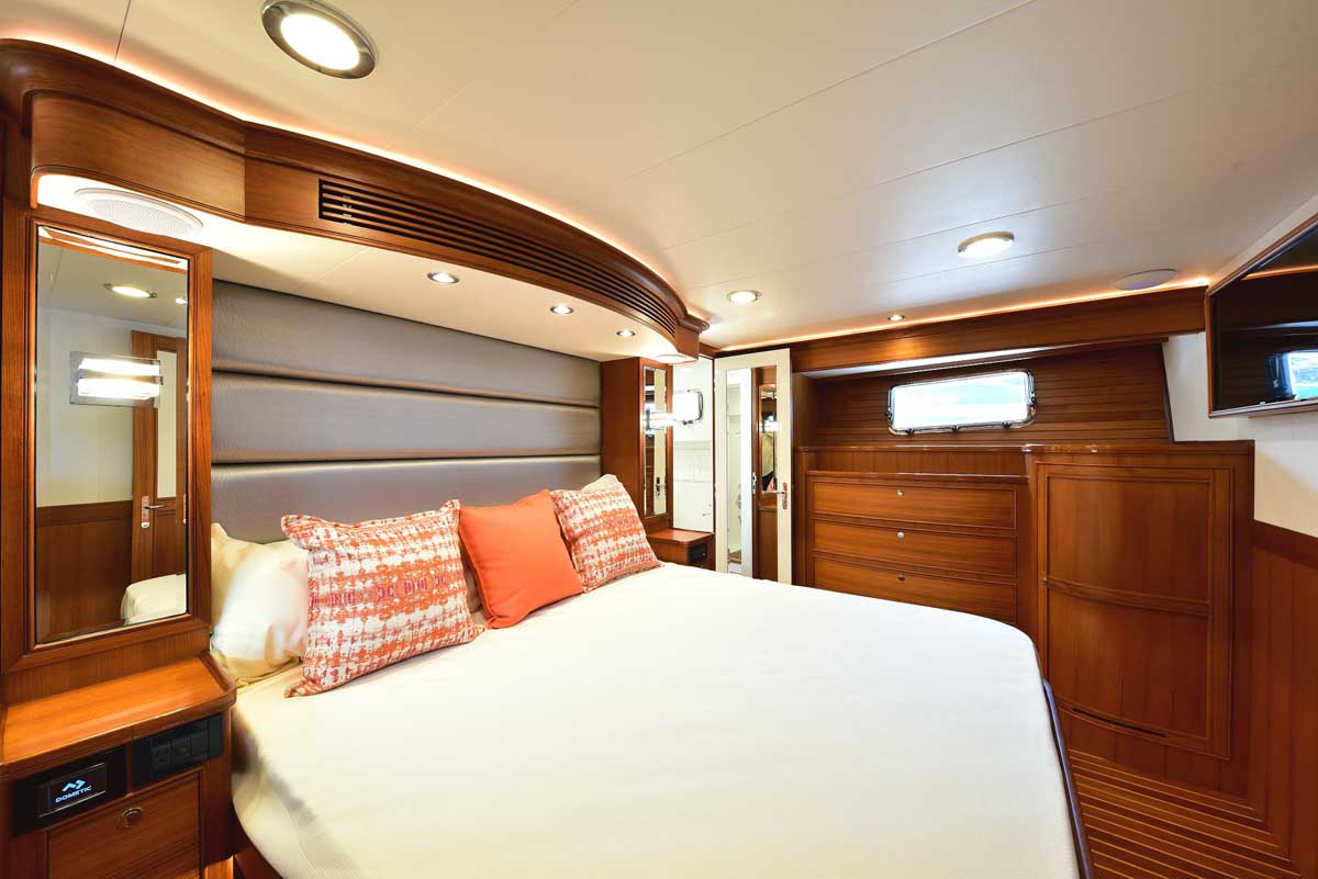 The Master stateroom features an Olympic Queen bed midline with hanging lockers and bureaus of drawers hull-side. With the additional storage drawers under the bed, there is enough space to pack for a very extended voyage! The master head, athwartship behind the bed, is artfully and precisely done to allow for a vanity and toilet area on each side connected by the shared shower. This is remarkable in this size yacht.