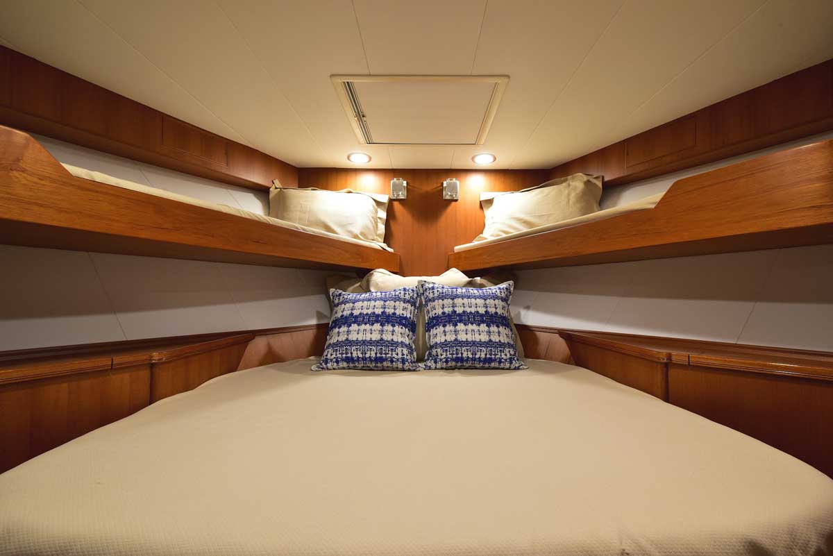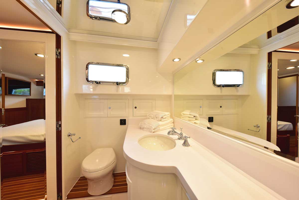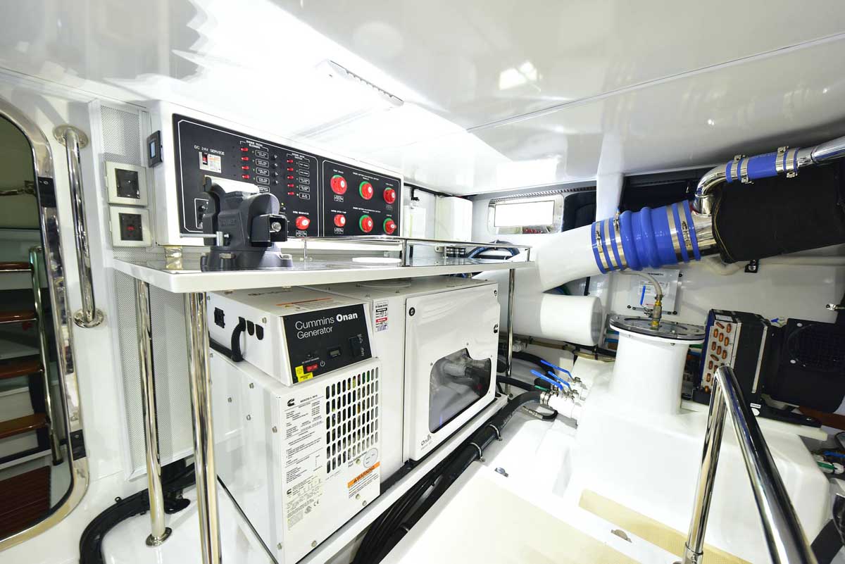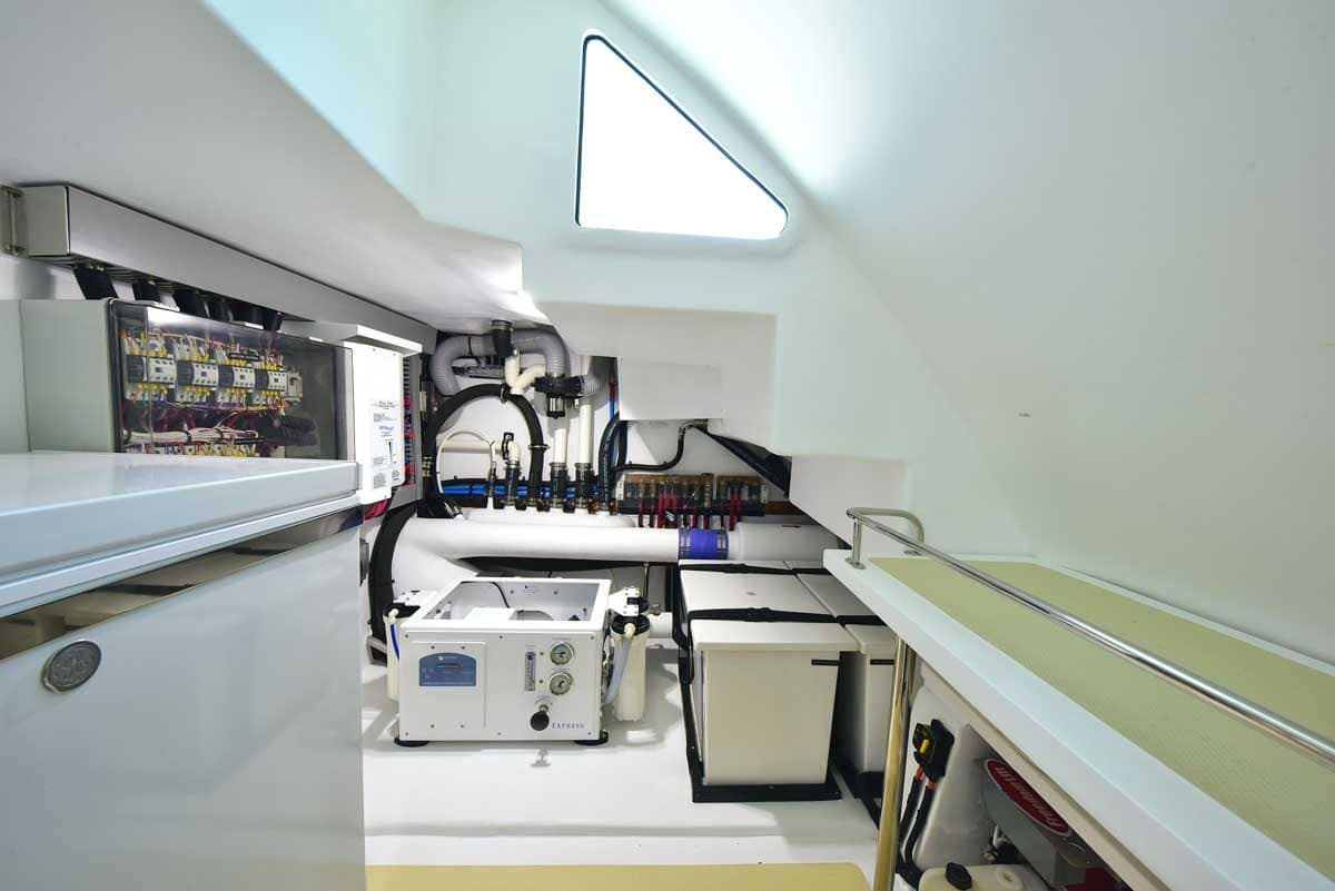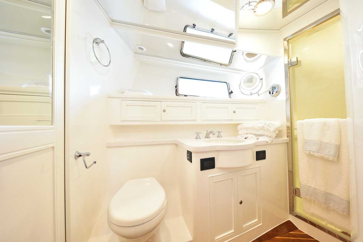 The engine room is the captain’s pride! This hull has twin John Deere engines, two Northern Lights generators, a state-of-the-art air conditioning system, and still room to stand and walk around the pristine space. The engine room is accessed through a transom lift door and, for access while at sea, a companionway from the master head shower. Brilliant!