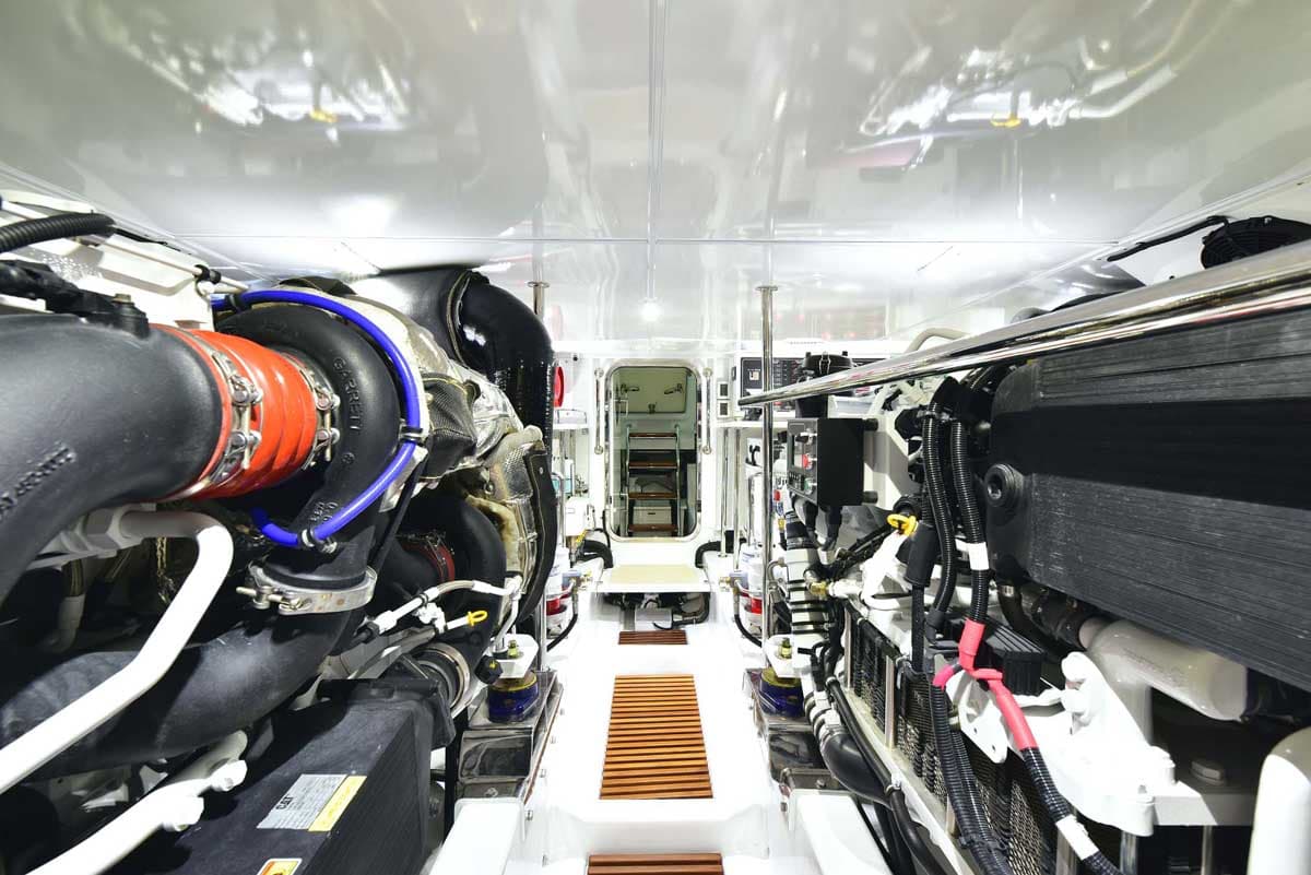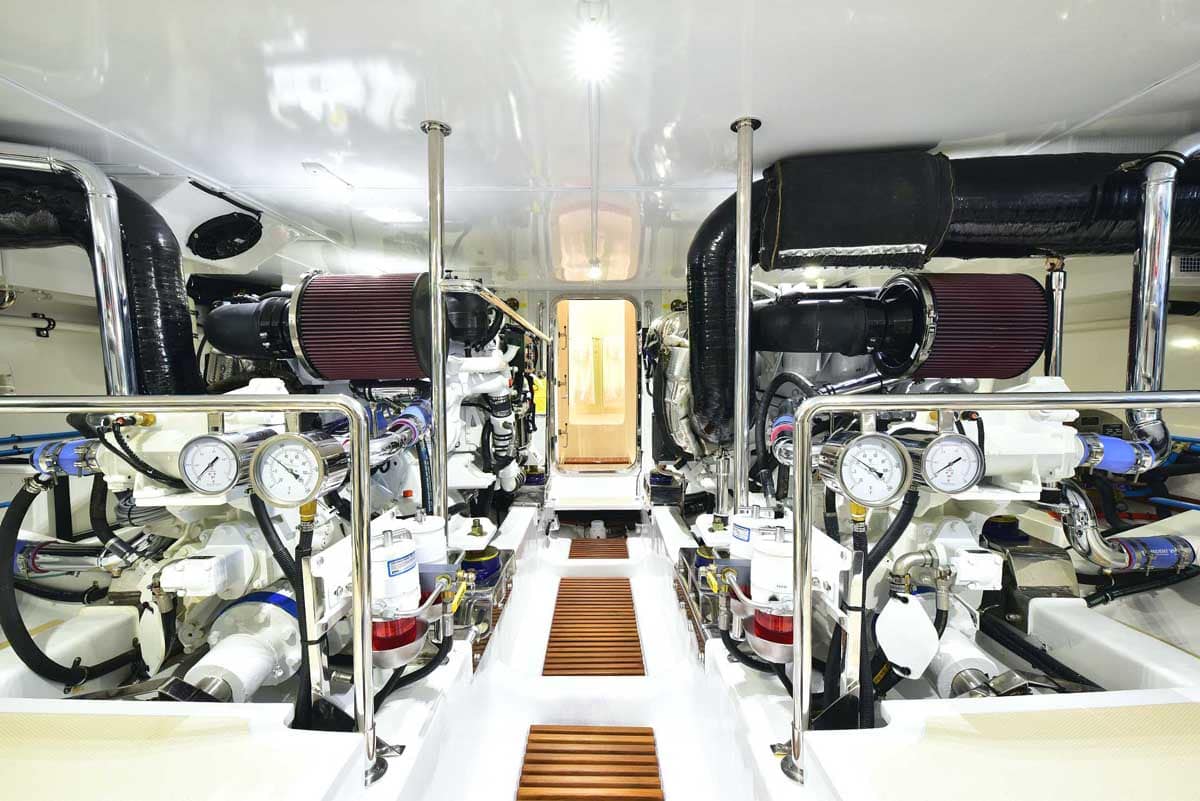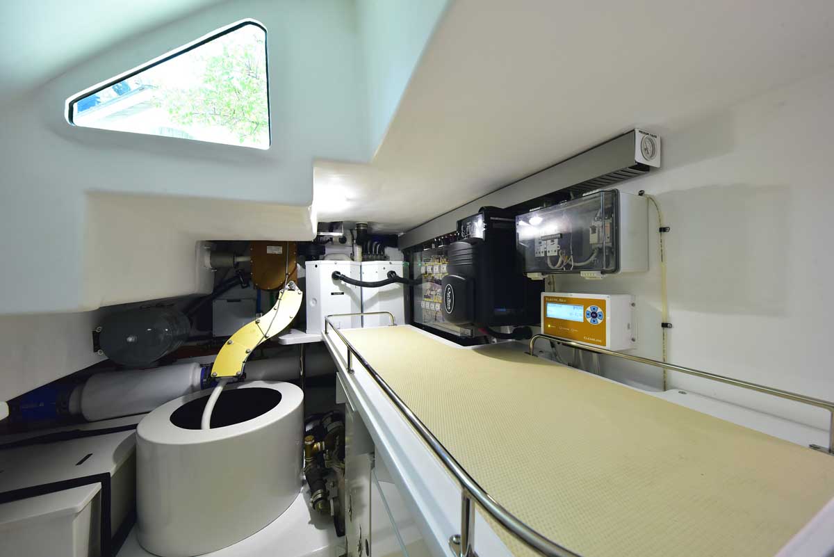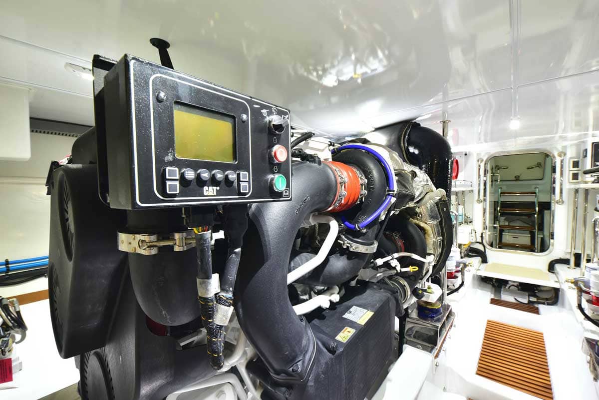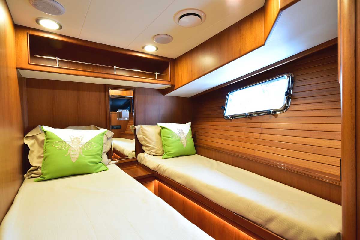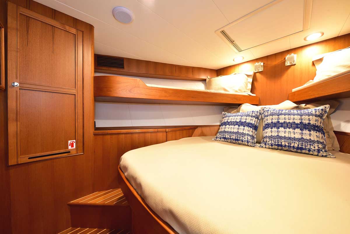 The engine room is the captain’s pride! This hull has twin John Deere engines, two Northern Lights generators, a state-of-the-art air conditioning system, and still room to stand and walk around the pristine space. The engine room is accessed through a transom lift door and, for access while at sea, a companionway from the master head shower. Brilliant!