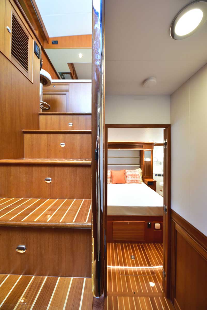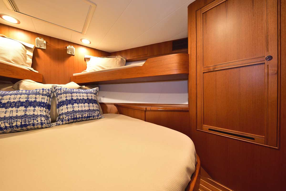 Below is a light-filled companionway featuring maple paneling and Ultraleather wall coverings, leading to the VIP and Master staterooms, a very large guest head, and an upper and lower berth tucked under the steps with our teak privacy curtain. The VIP has a queen bed with twin cedar-lined hanging lockers and a private entry door to the head. This head has a full glass-enclosed shower and a beautiful glass-fronted locker for linens. Next to the Master stateroom, behind beautifully finished maple cabinetry, are the washer/dryer and a freezer.