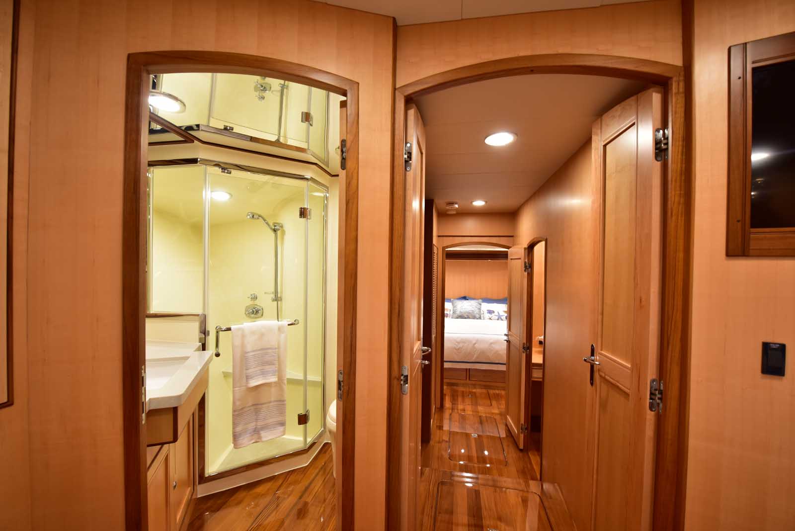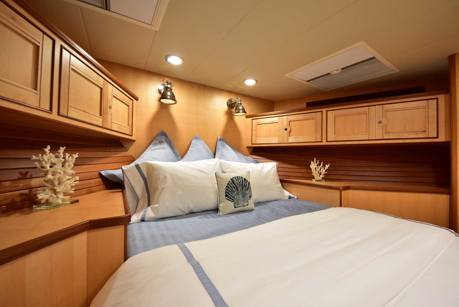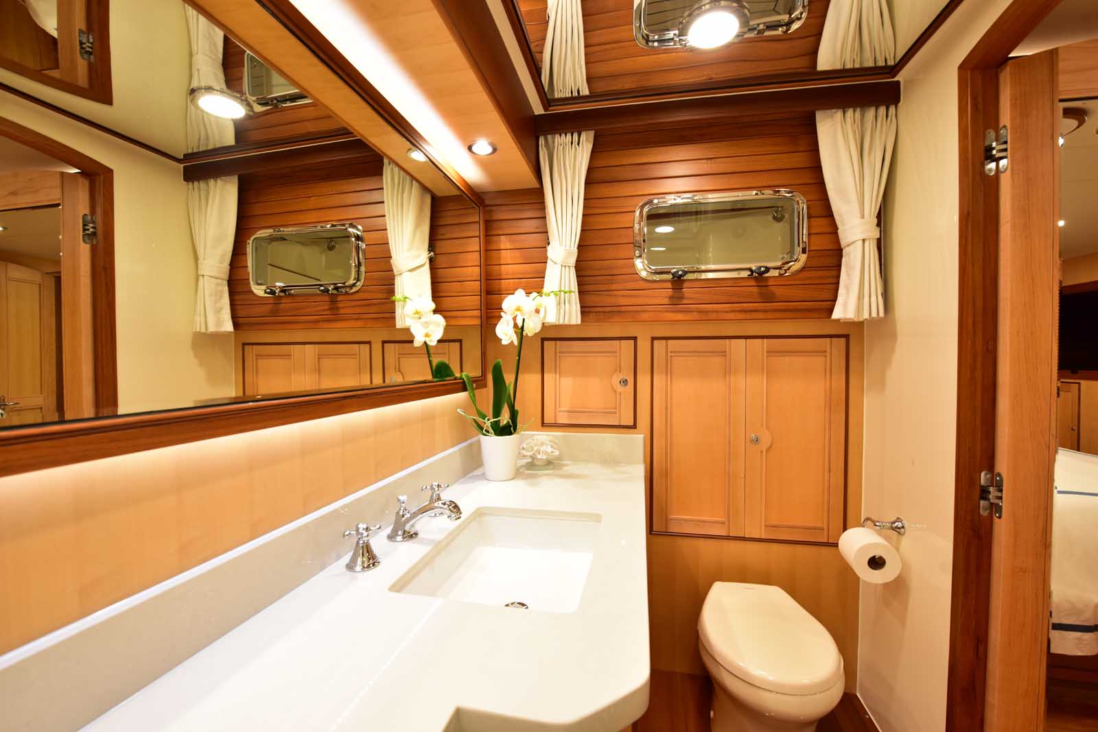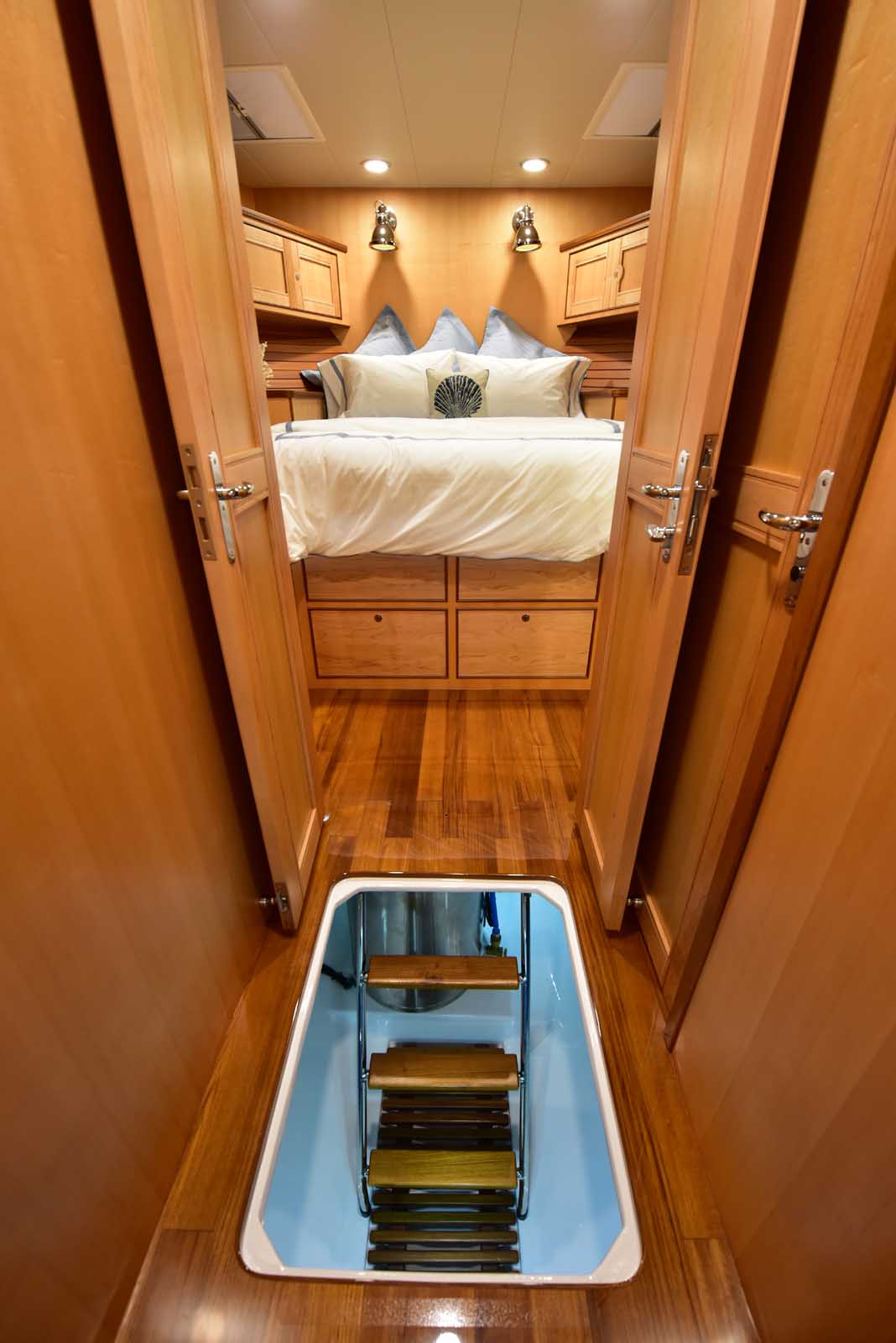 The layout below, in the first of this series, features two very large staterooms, each with its own luxurious head. The open companionway is bathed in light from overhead mirrored sunlight. The volume, comfort, and conveniences rival yachts ten feet longer, and the quality of the fit and finish of the joinery, woodworking, and fabrics are rival to none. The world-class quality found in this and all Marlow yachts compels, once again, our company motto – “Sometimes Words are Simply Inadequate.”