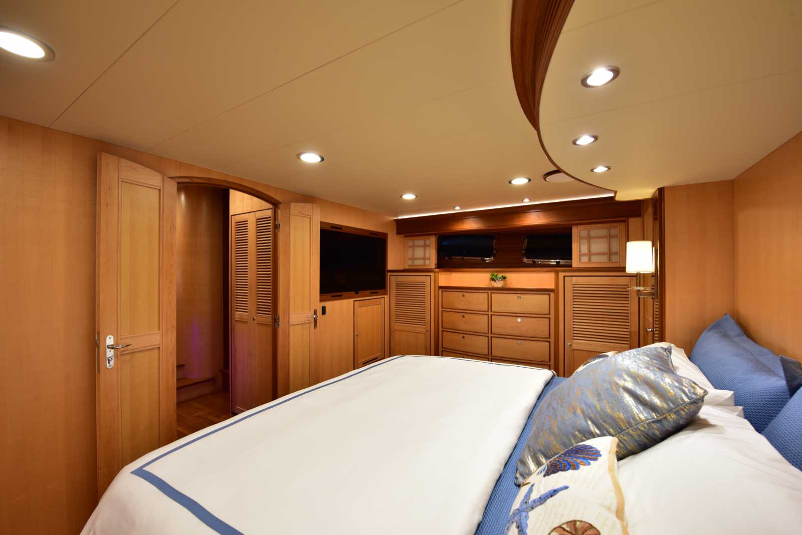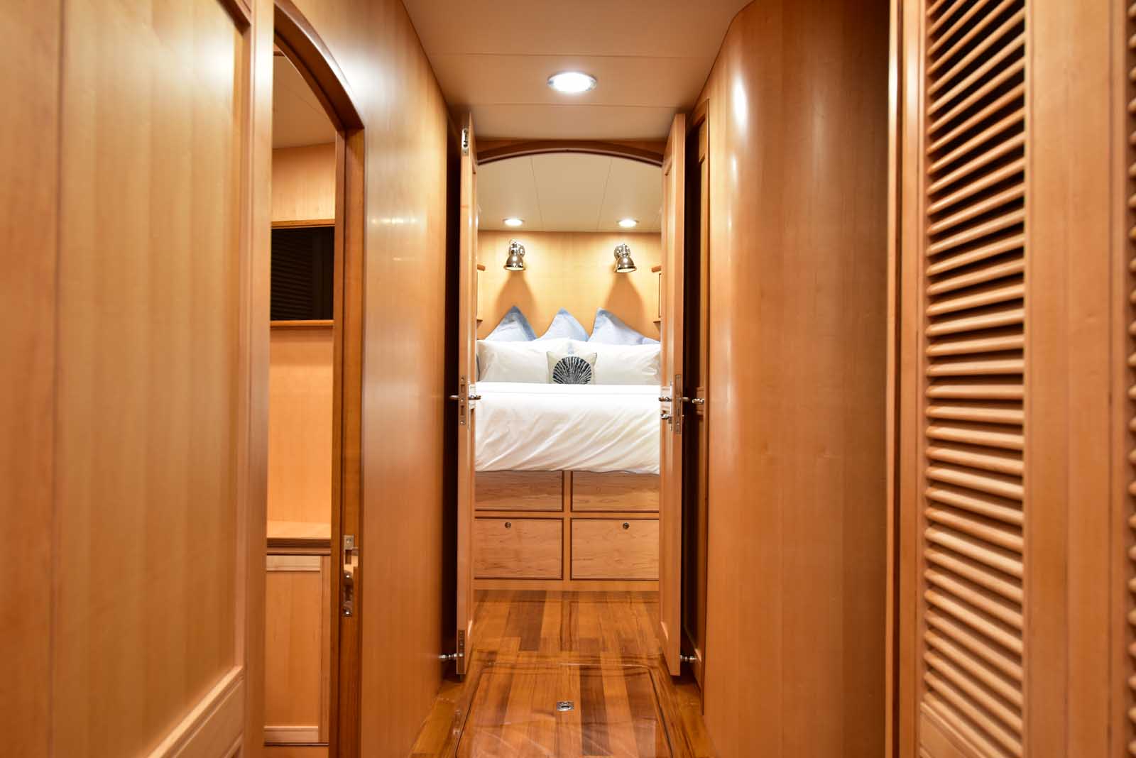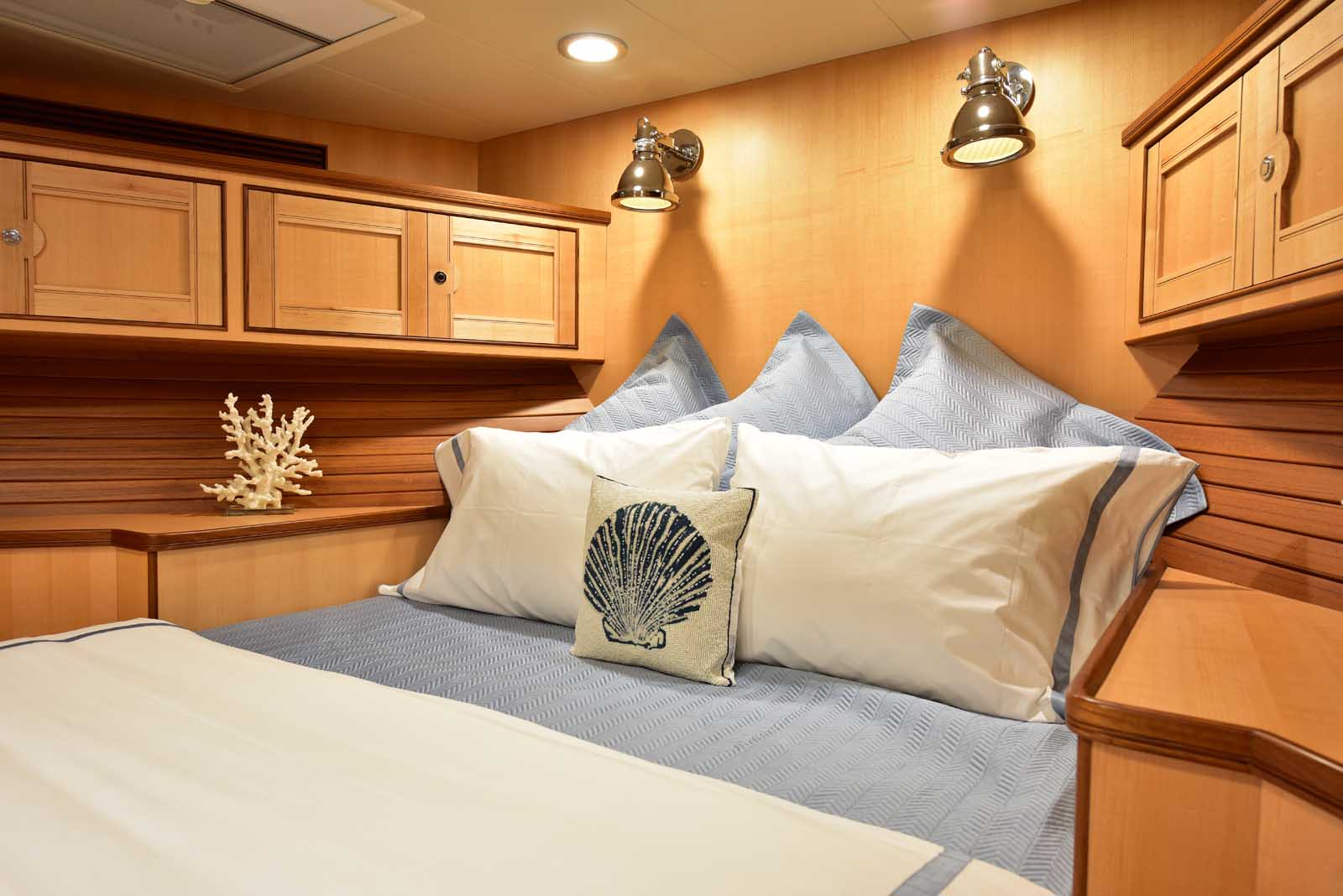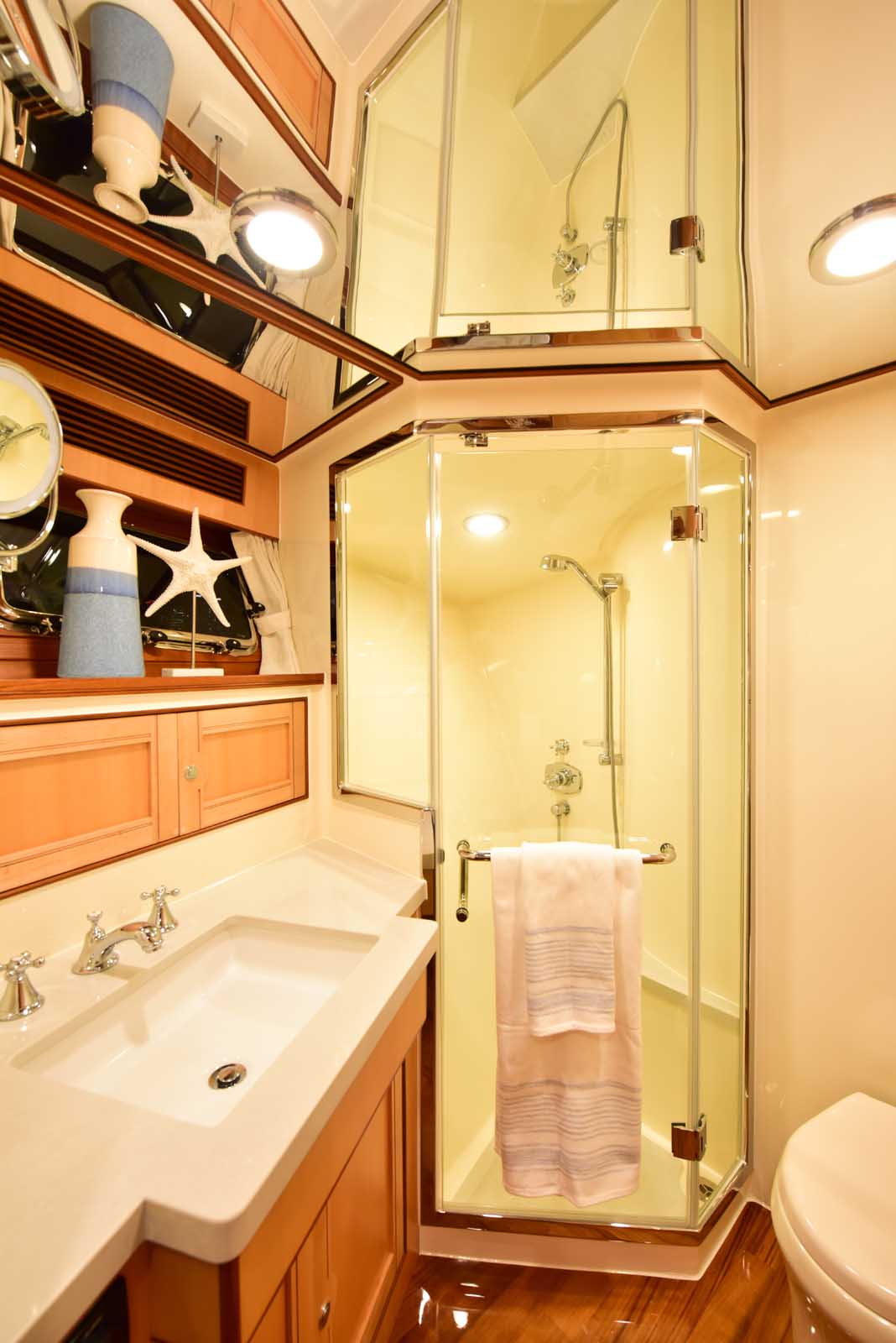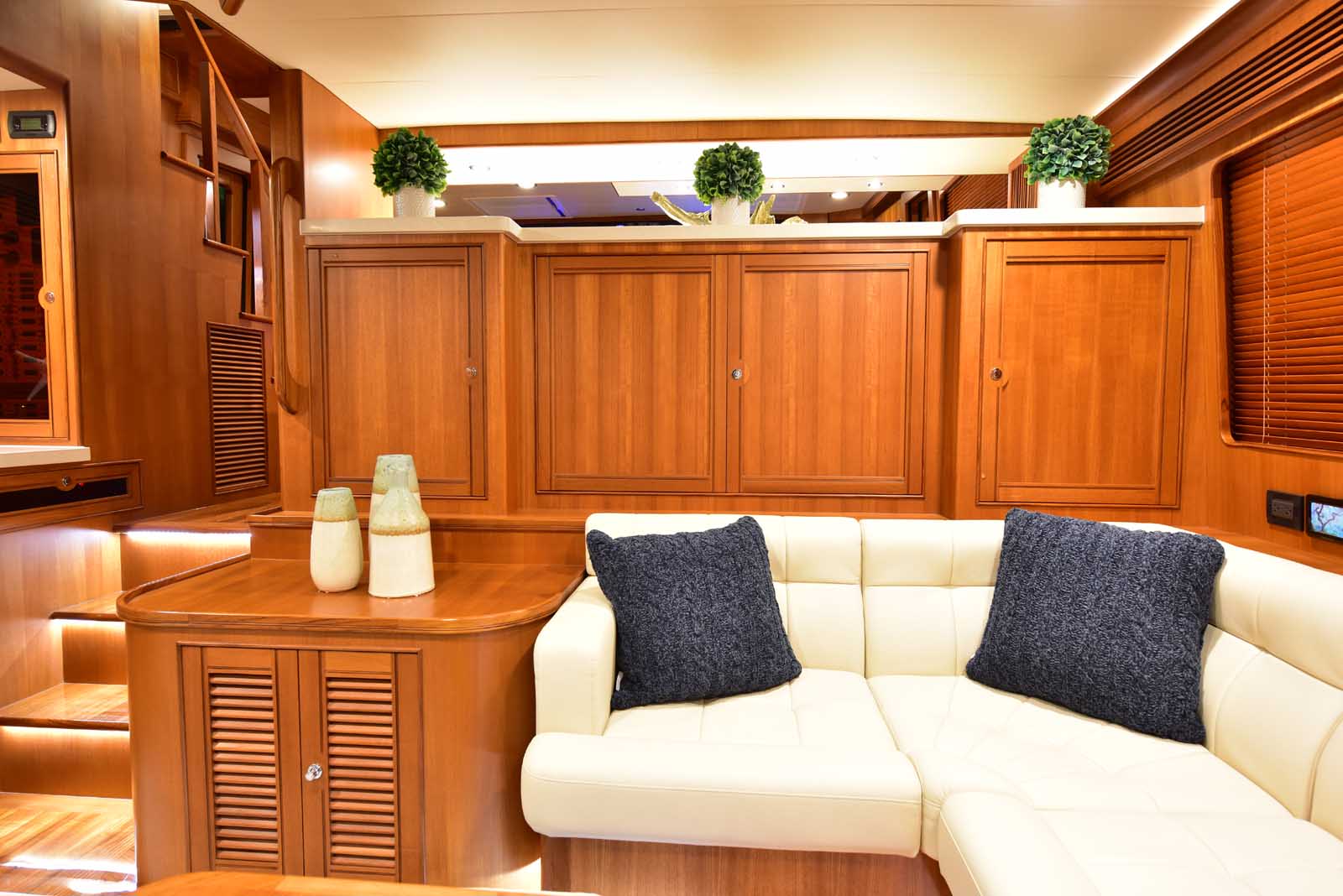 The layout below, in the first of this series, features two very large staterooms, each with its own luxurious head. The open companionway is bathed in light from overhead mirrored sunlight. The volume, comfort, and conveniences rival yachts ten feet longer, and the quality of the fit and finish of the joinery, woodworking, and fabrics are rival to none. The world-class quality found in this and all Marlow yachts compels, once again, our company motto – “Sometimes Words are Simply Inadequate.”
