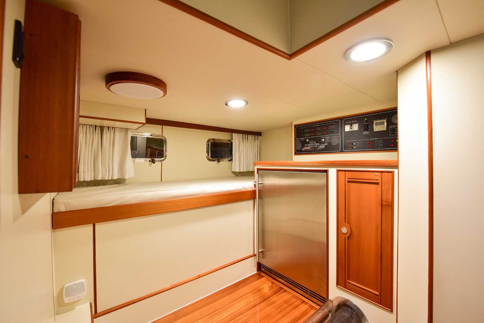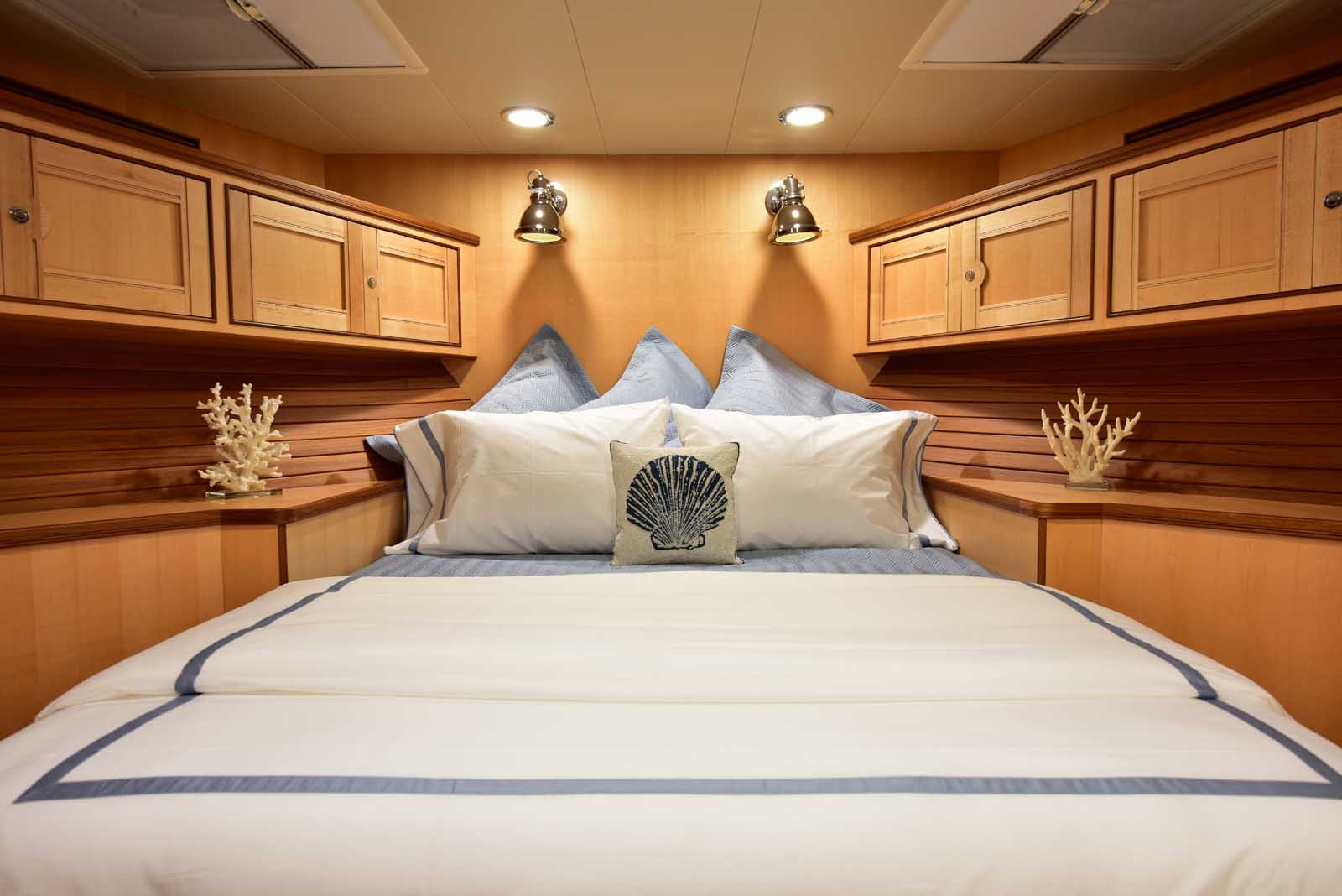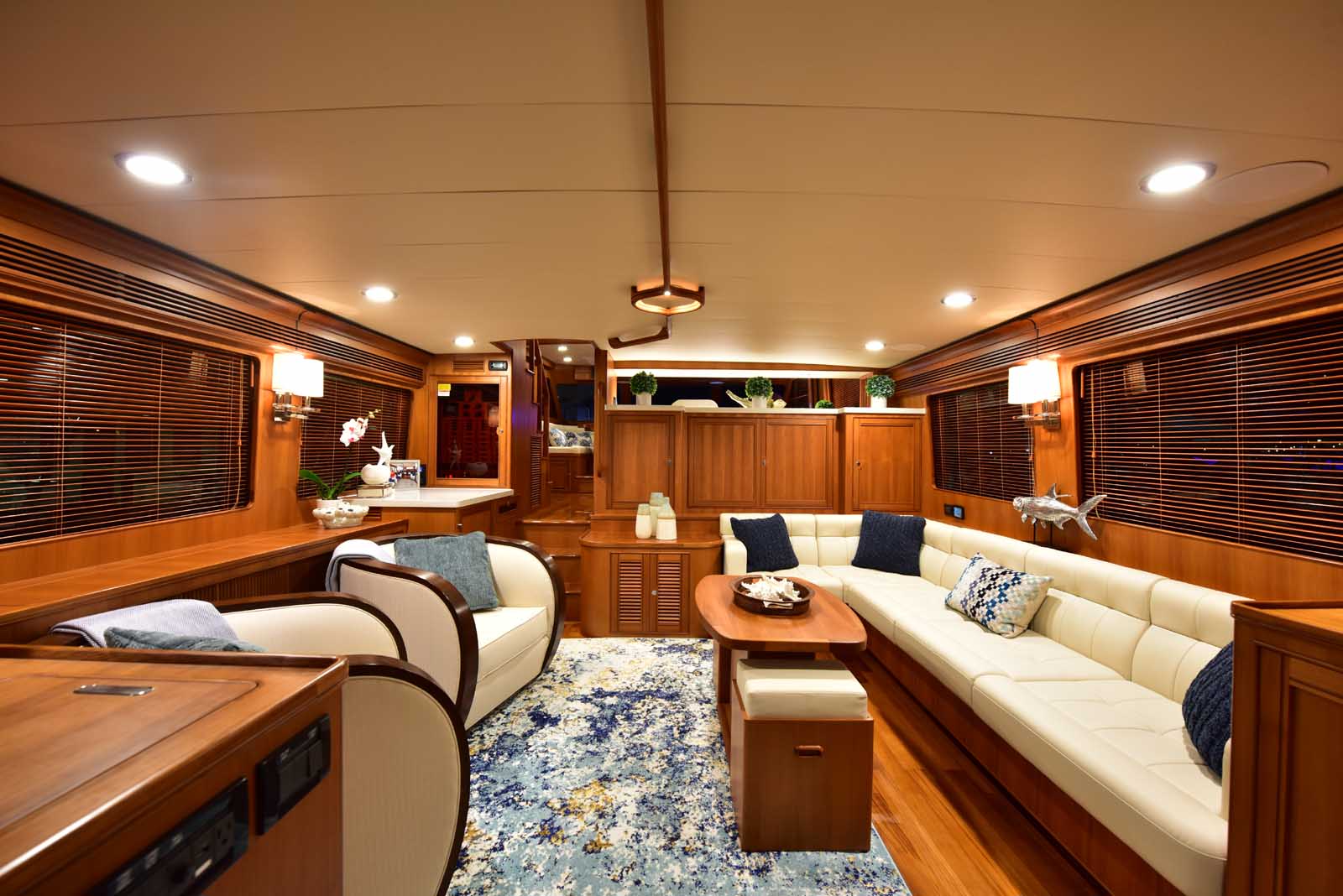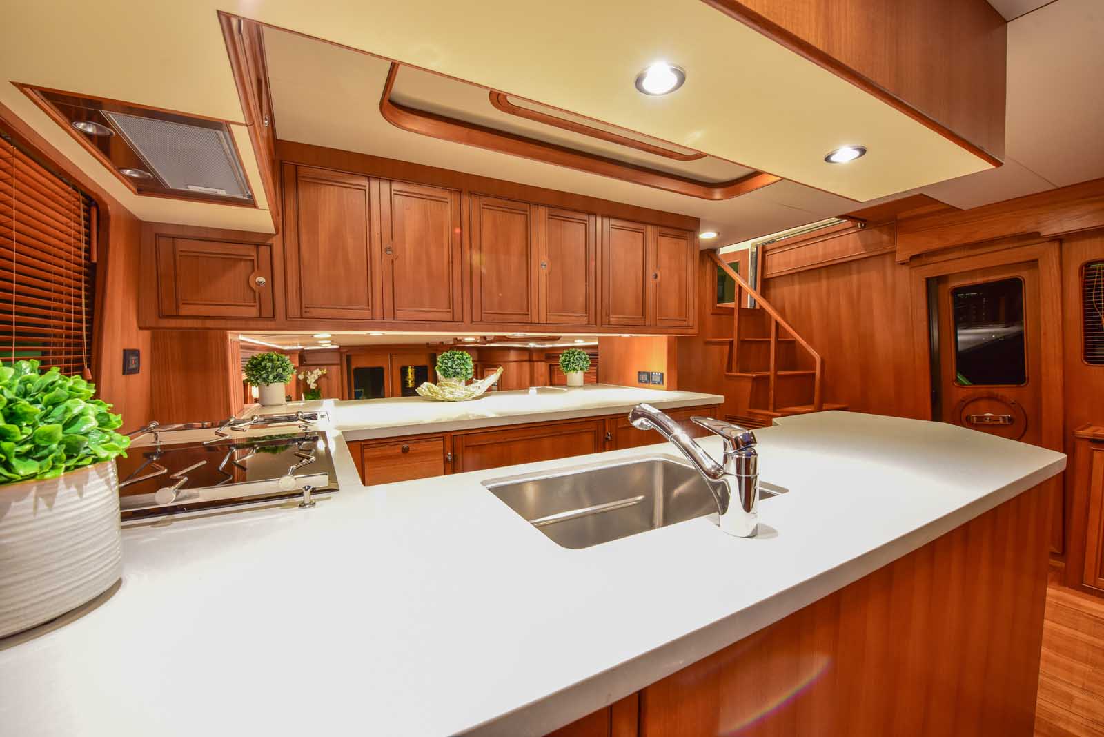 The layout below, in the first of this series, features two very large staterooms, each with its own luxurious head. The open companionway is bathed in light from overhead mirrored sunlight. The volume, comfort, and conveniences rival yachts ten feet longer, and the quality of the fit and finish of the joinery, woodworking, and fabrics are rival to none. The world-class quality found in this and all Marlow yachts compels, once again, our company motto – “Sometimes Words are Simply Inadequate.”