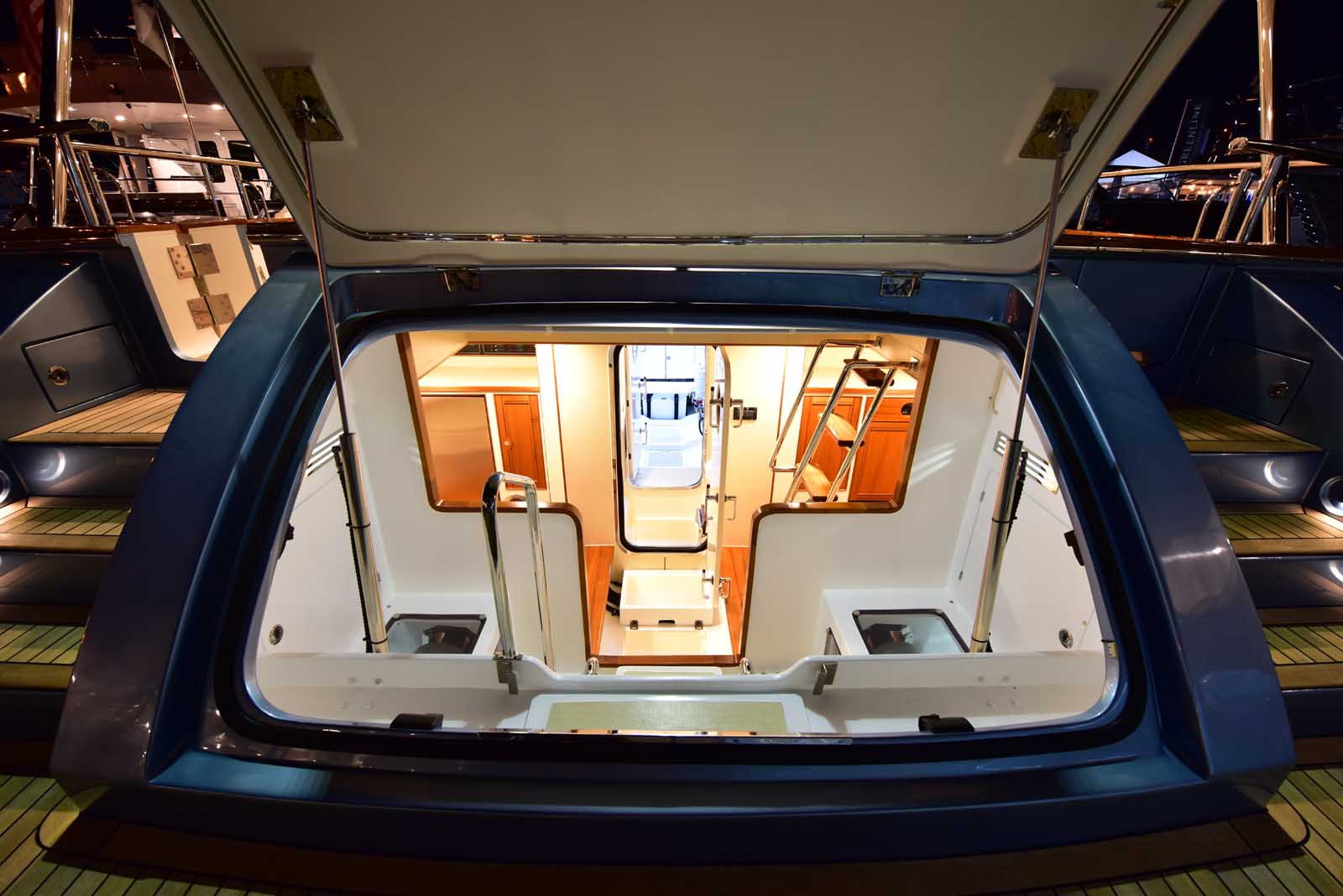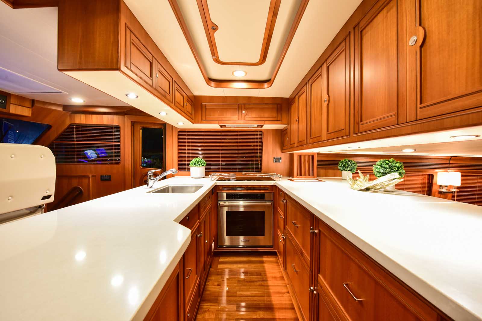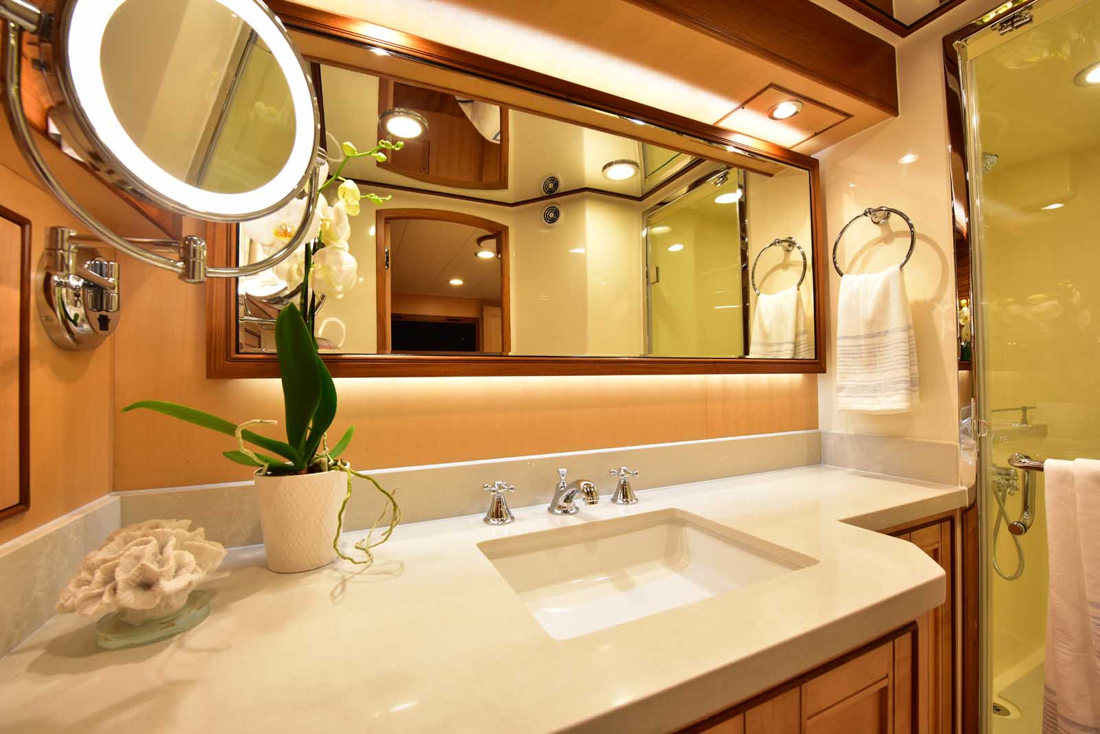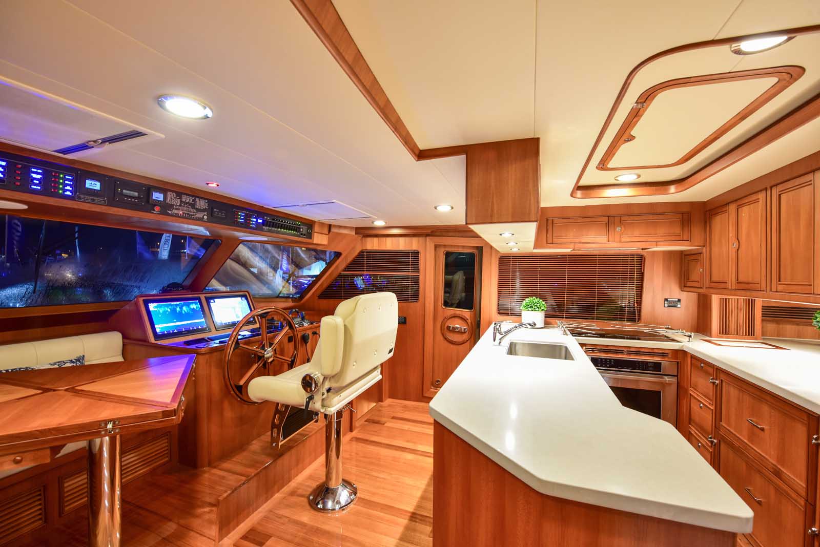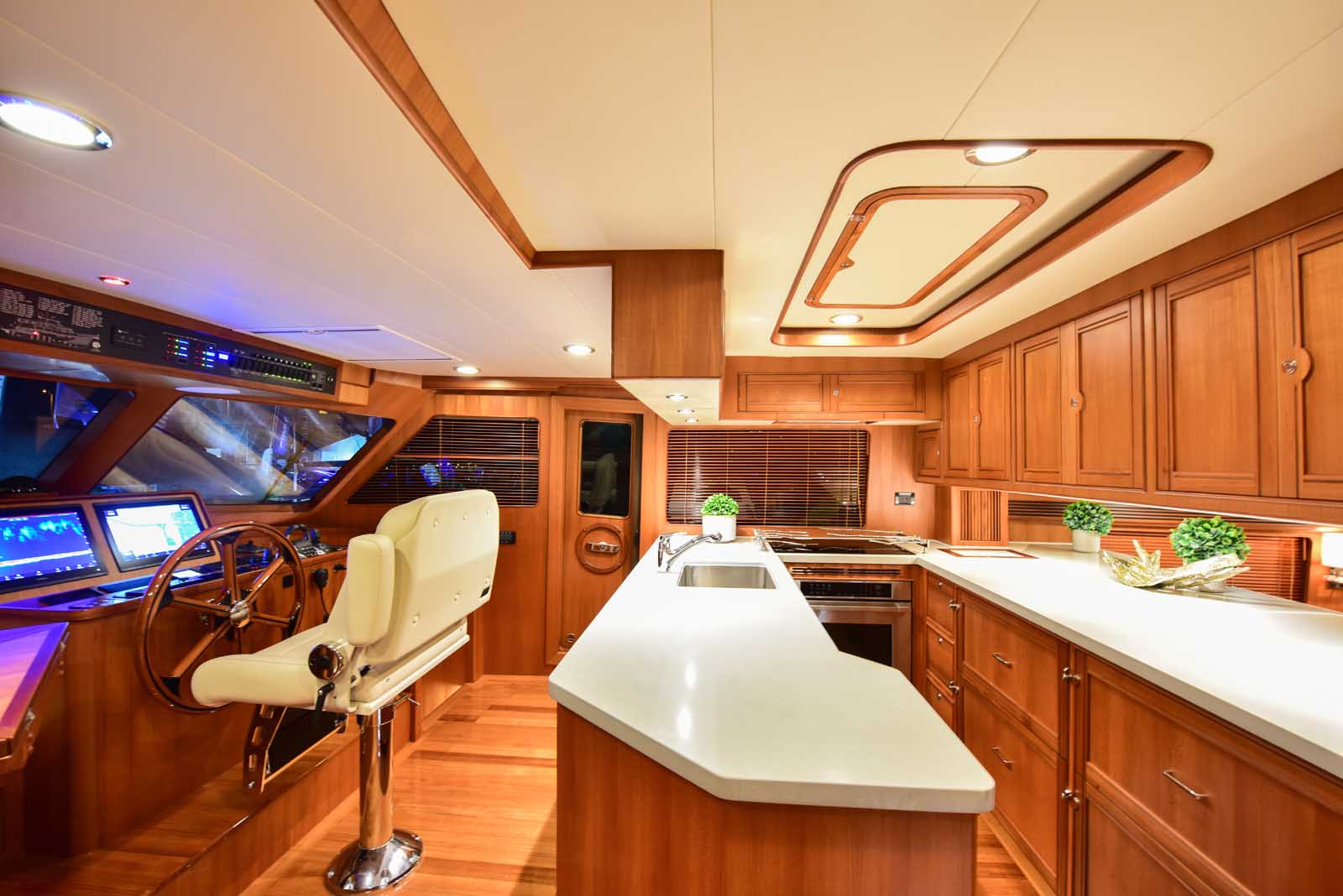 The layout below, in the first of this series, features two very large staterooms, each with its own luxurious head. The open companionway is bathed in light from overhead mirrored sunlight. The volume, comfort, and conveniences rival yachts ten feet longer, and the quality of the fit and finish of the joinery, woodworking, and fabrics are rival to none. The world-class quality found in this and all Marlow yachts compels, once again, our company motto – “Sometimes Words are Simply Inadequate.”