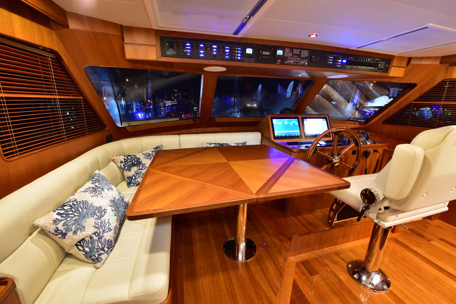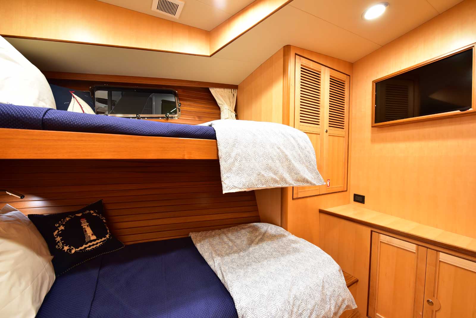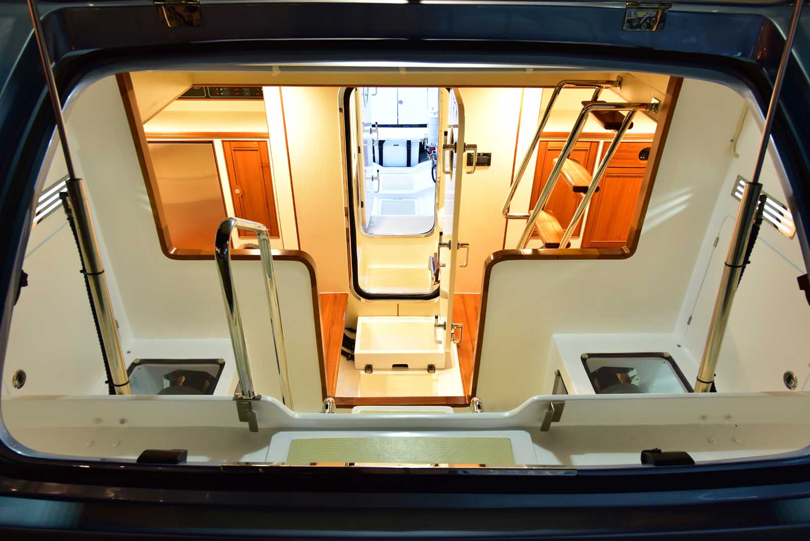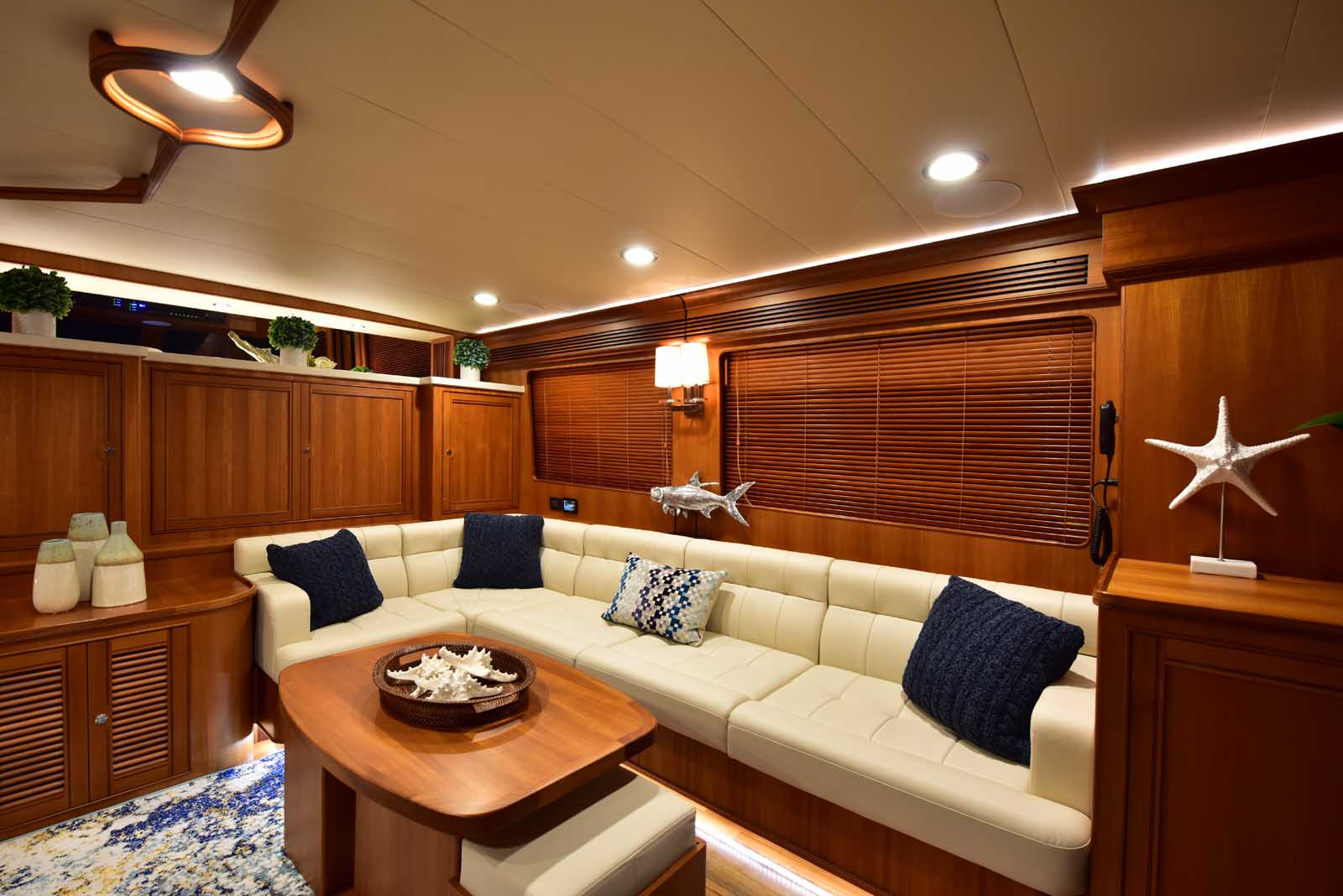 The layout below, in the first of this series, features two very large staterooms, each with its own luxurious head. The open companionway is bathed in light from overhead mirrored sunlight. The volume, comfort, and conveniences rival yachts ten feet longer, and the quality of the fit and finish of the joinery, woodworking, and fabrics are rival to none. The world-class quality found in this and all Marlow yachts compels, once again, our company motto – “Sometimes Words are Simply Inadequate.”